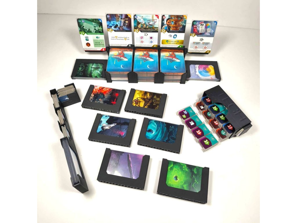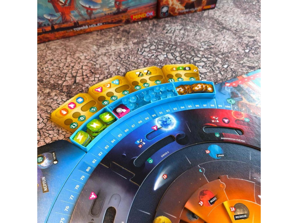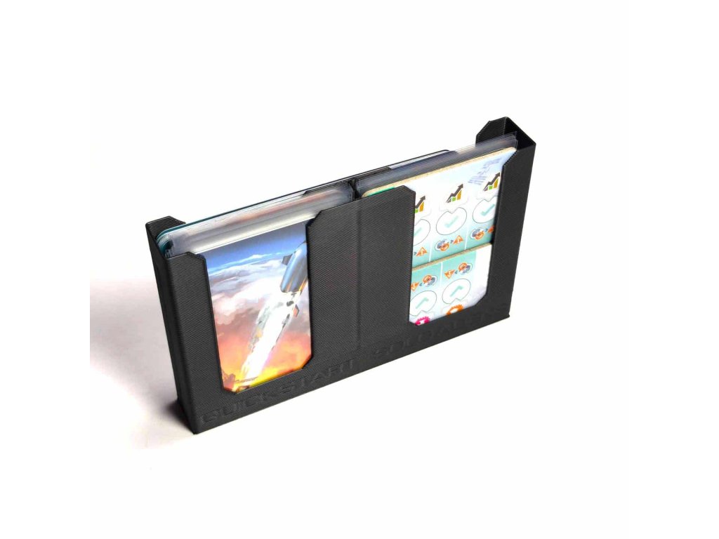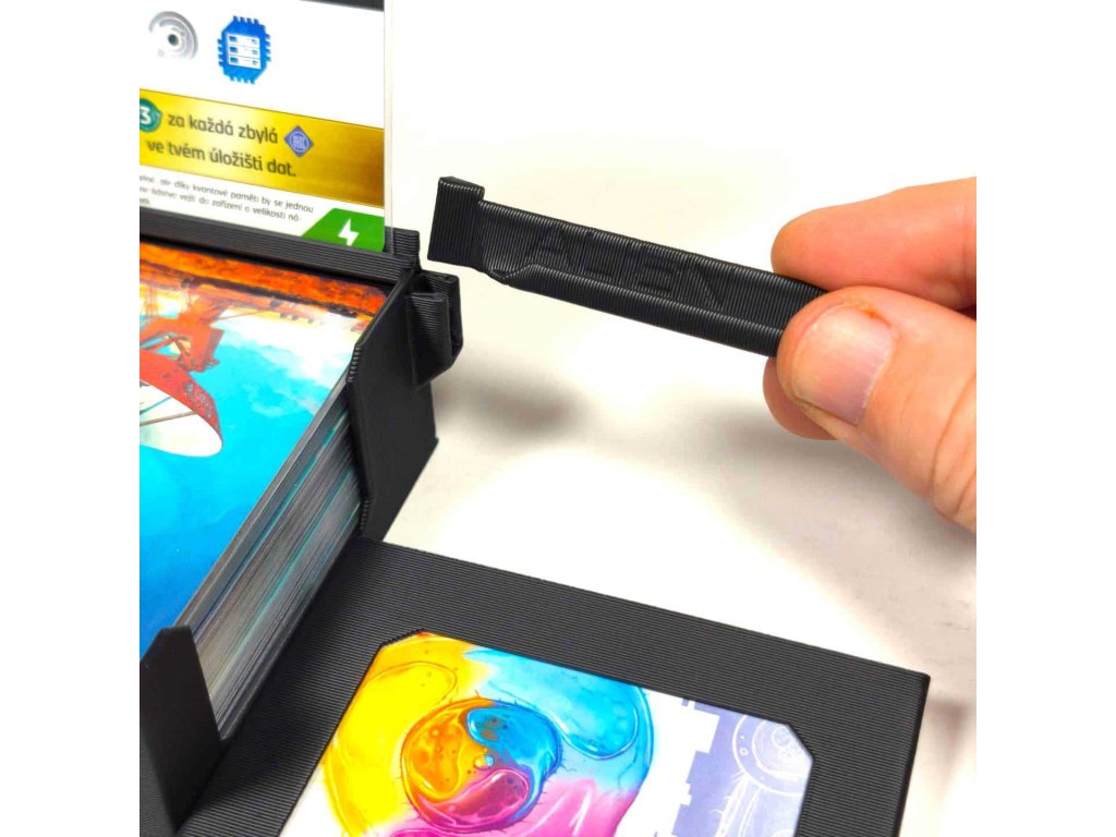 - Trojbox na karty jen vyložíte na stůl a hrajete. Karty nabídky lze vyložit do drážky. Na bok lze zasunout další dva držáky na karty mimozemských civilizací.