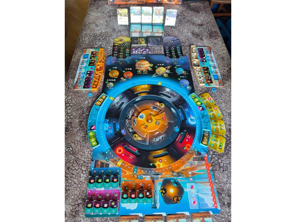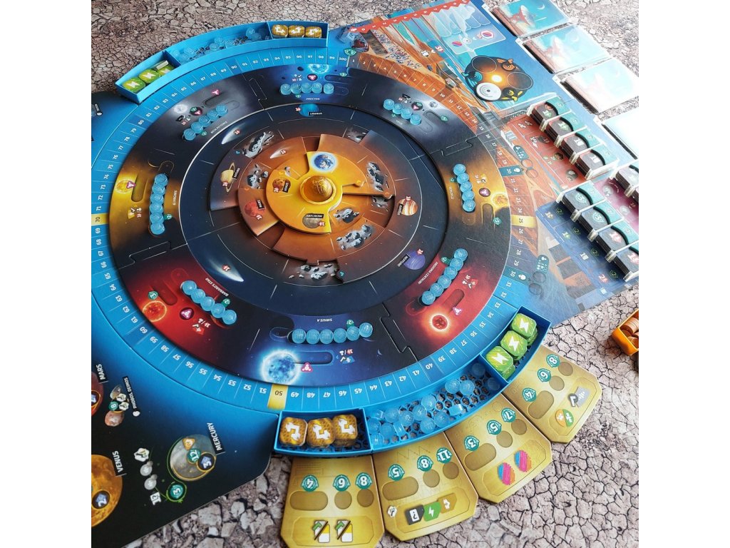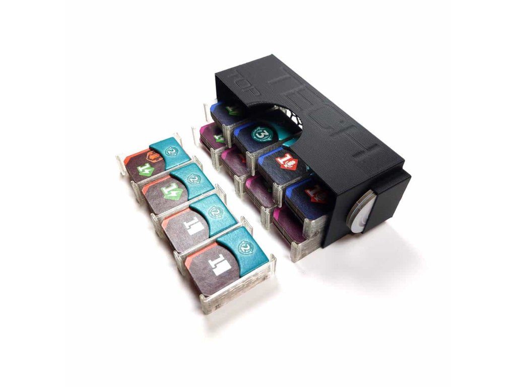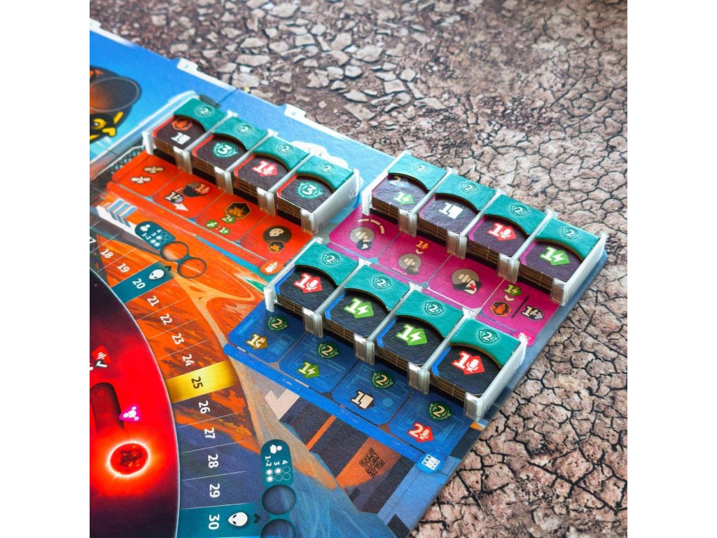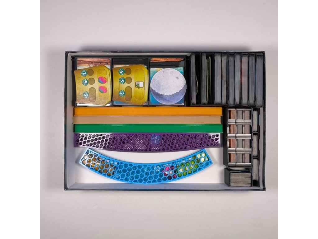 - Trojbox na karty jen vyložíte na stůl a hrajete. Karty nabídky lze vyložit do drážky. Na bok lze zasunout další dva držáky na karty mimozemských civilizací.