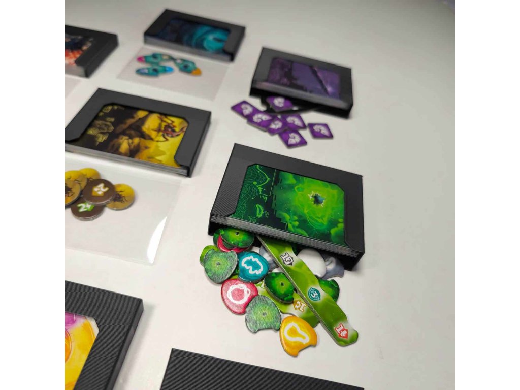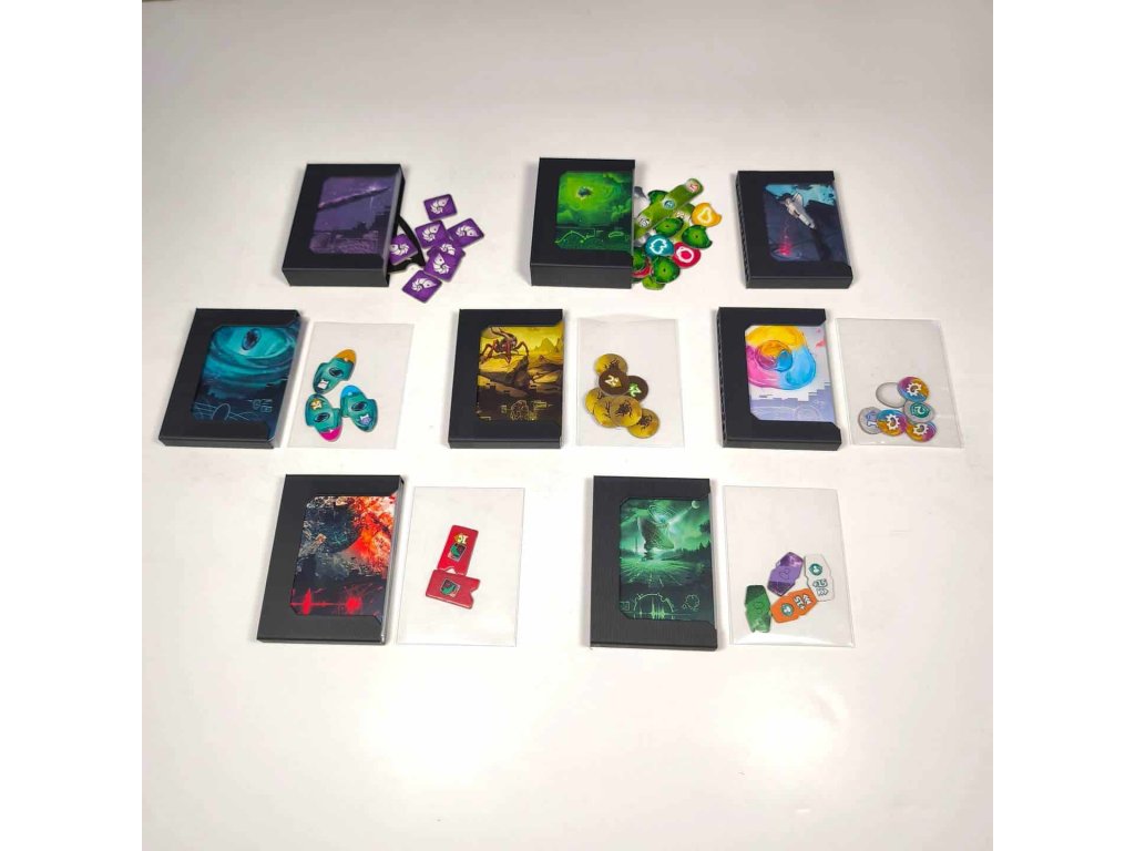 - Mimozemské karty a komponenty jsou uloženy v samostatných boxech. Pět ras mají kartonové žetony uloženy jednoduše v obalu od karty.