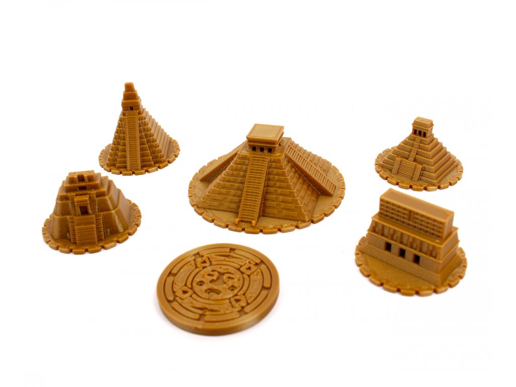 Modely chrámů Tikal, Chichén Itzá, Uxmal, Yaxchilán, Paleque a reliéf na kolo kalendáře pro hru Tzolkin: Mayský kalendář.