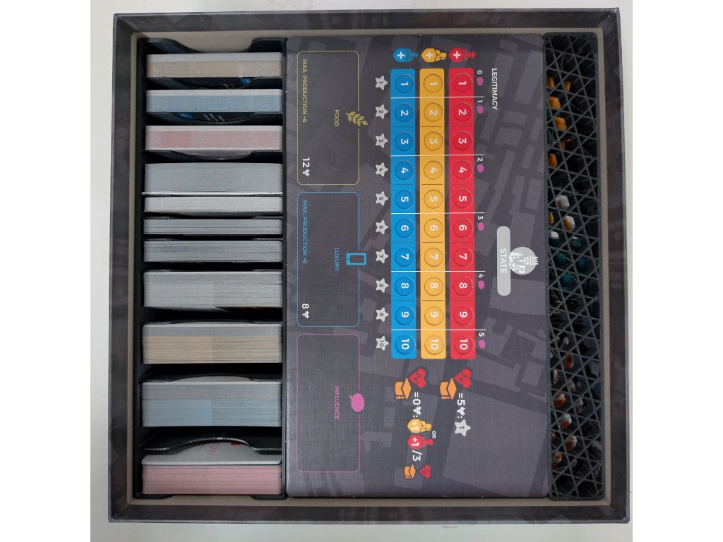 Compatible with Hegemony: Lead Your Class to Victory - Extended Edition (2023) Deployment tool on the company card for clear definition of the payroll indicator Includes 29 pieces of payout aids These aids can be stored within our inserter in a new version that replaces several boxes This new version can be ordered here in variants. This new variant includes: A box for wheel...