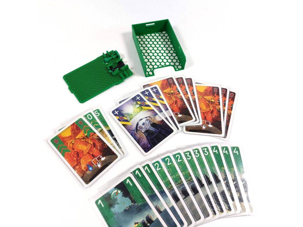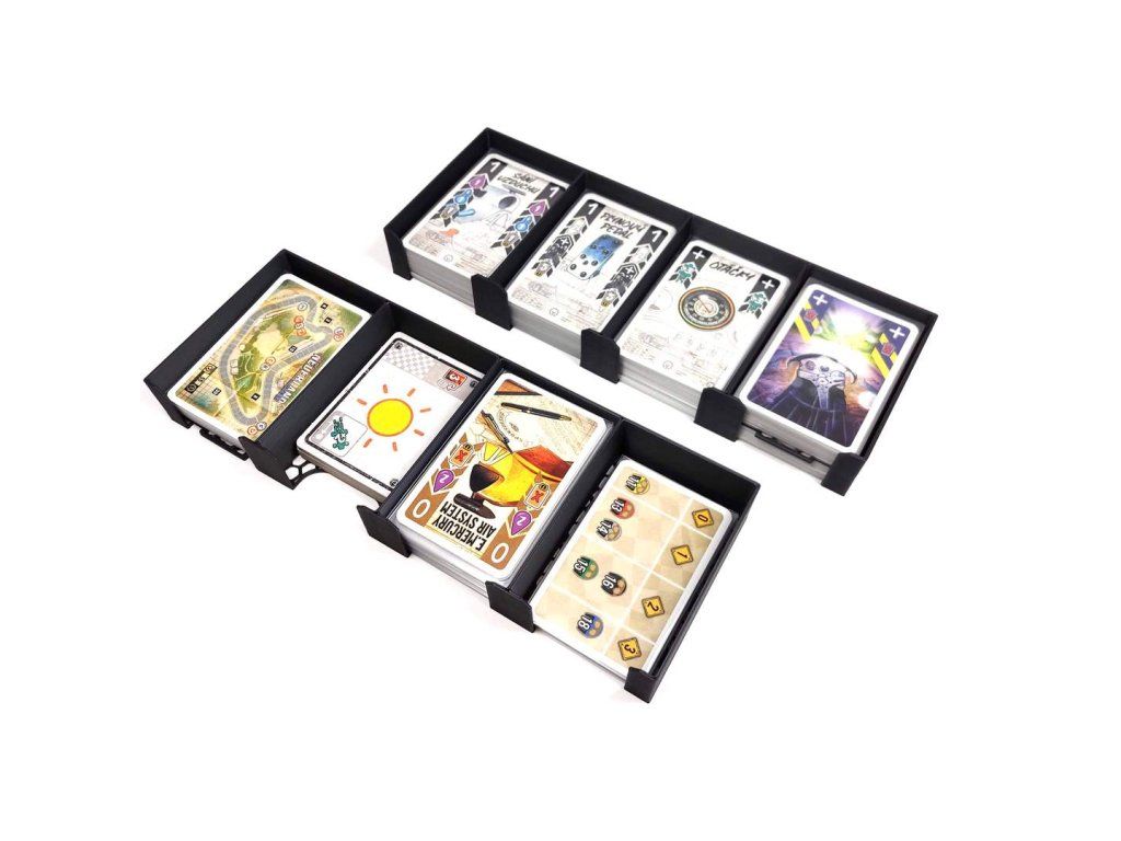 - Two four-card boxes then take care of the rest of the cards. One box also stores the weather modification tiles . Three dividers then take care of separating the cards, for example, during the championship.