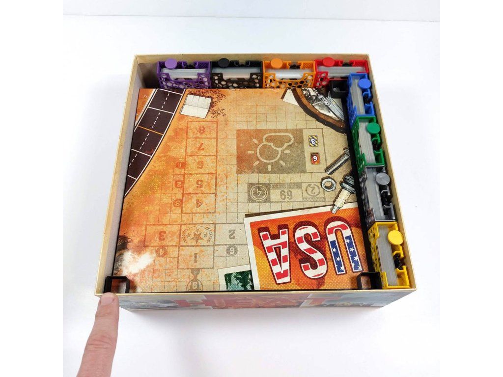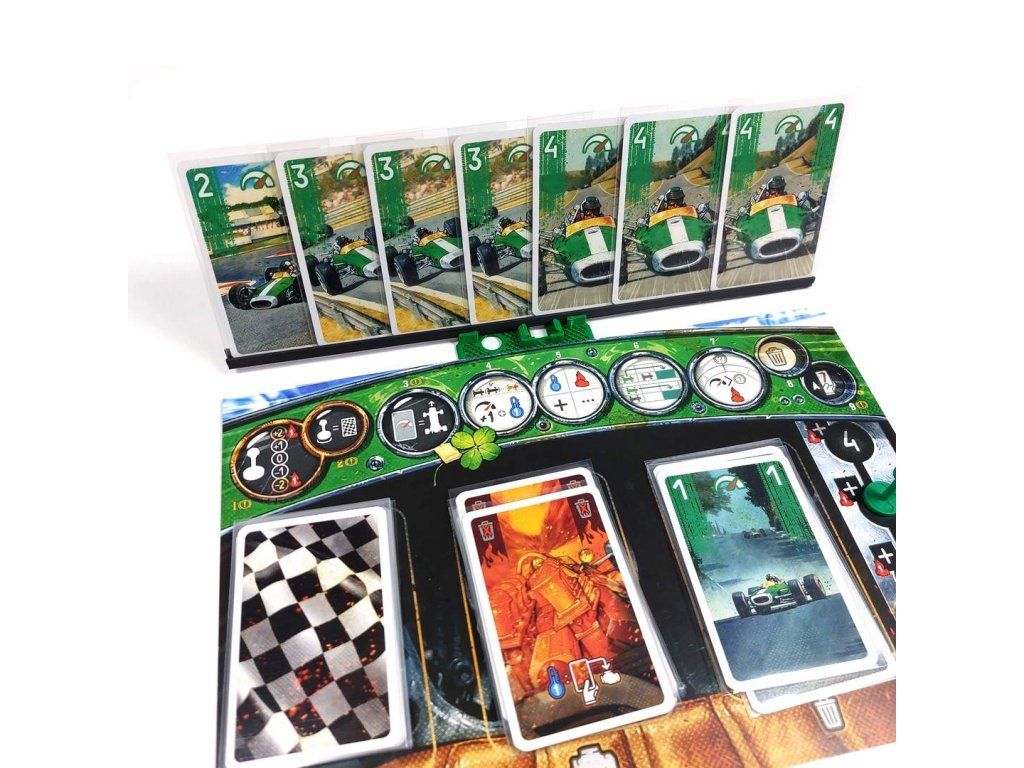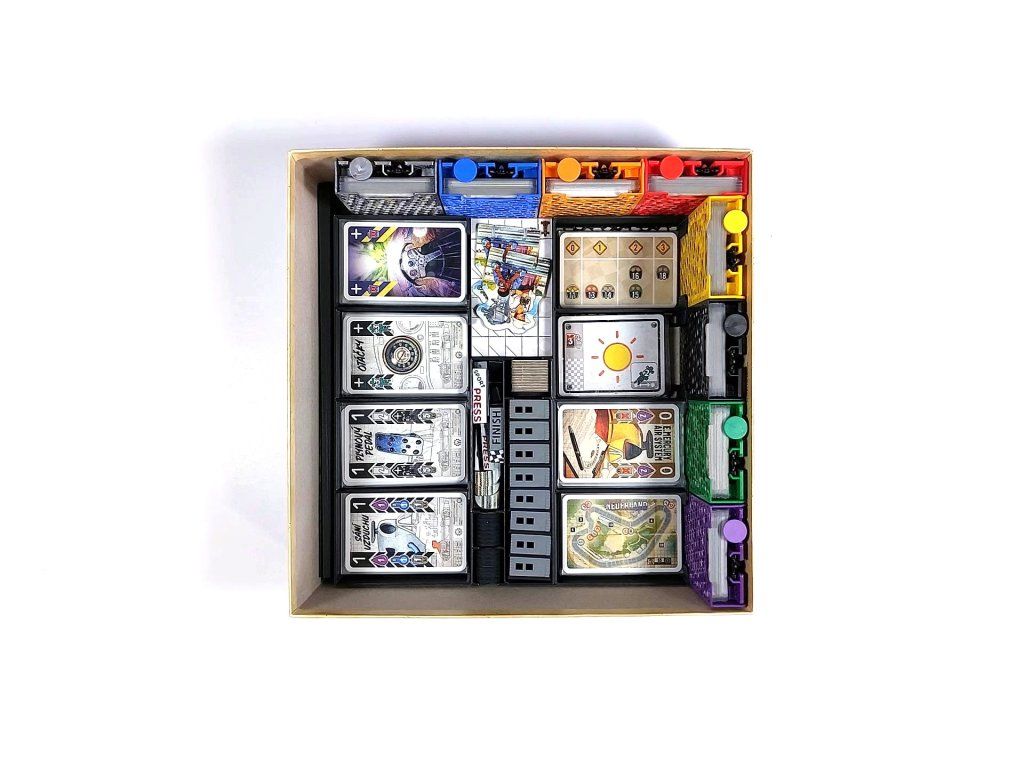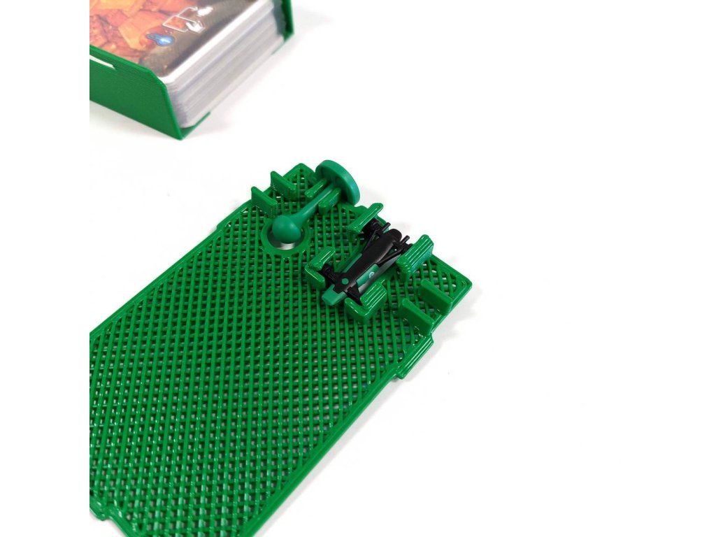 - Moreover, the lid is multifunctional. It can be inserted under the player's board and a card holder can be placed on it. The gear lever and formula are then stored directly in the lid.