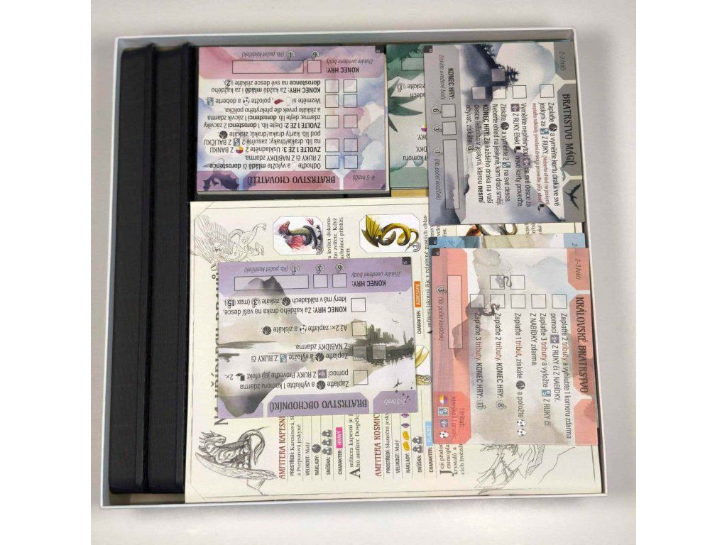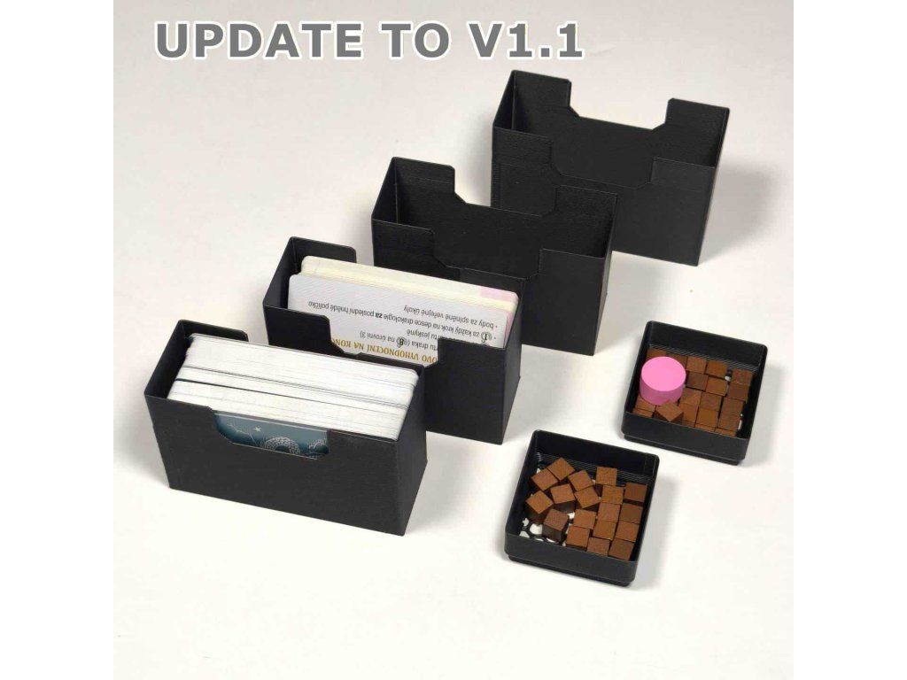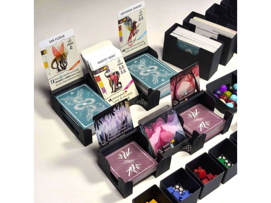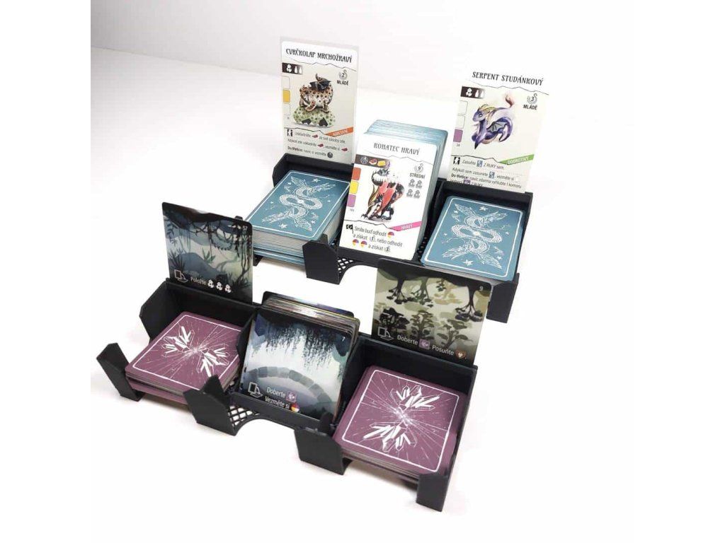 - Two triple boxes serve both for storing cards and during gameplay. They feature a groove so that a played card can be stood upright.