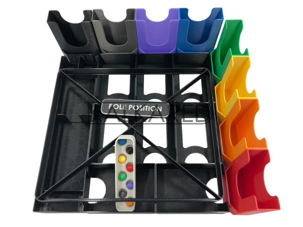 Garage miniatures are designed to illustrate the atmosphere of the race track and can be loaded with tokens indicating the condition of the track. They can be combined with tracks from both the Heat base game and the Heavy Rain expansion. Material: PLA