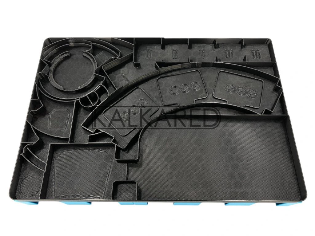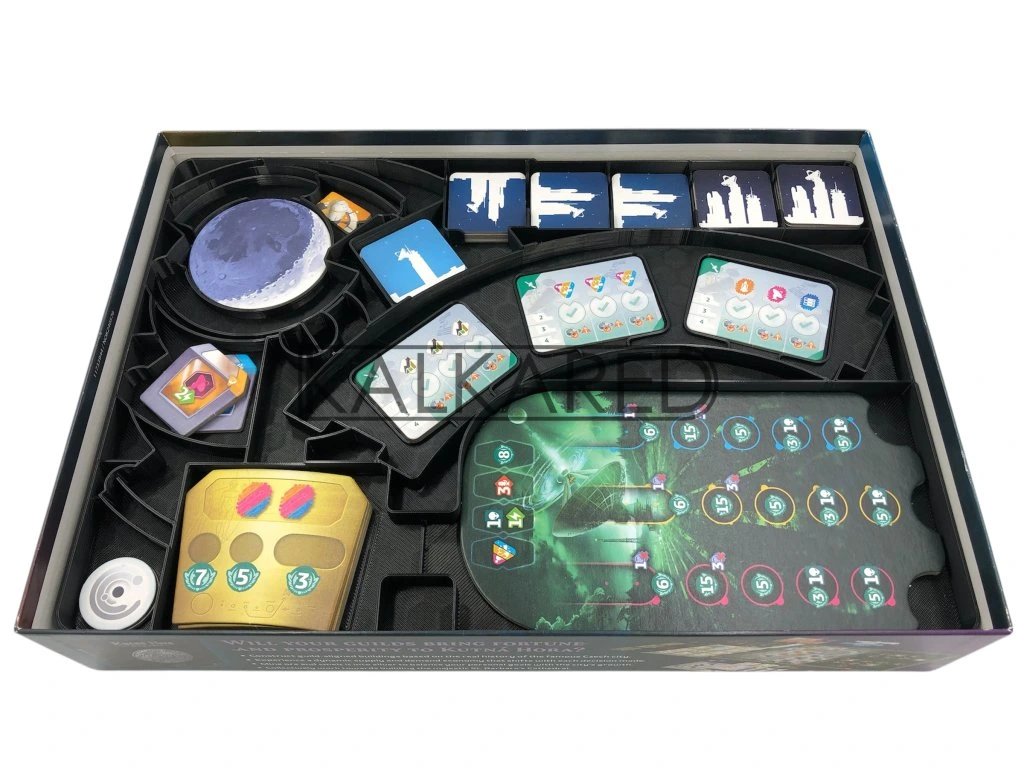 The insert is printed using a 3D printer, it is designed so that all the components fit perfectly, but are also easy to remove. In addition, this insert is also designed for wrapped cards. It speeds up the preparation, the folding (by a few minutes) but also the flow of the game and allows a safer storage of the game components. This is not an officially licensed product. Dimensions of the...