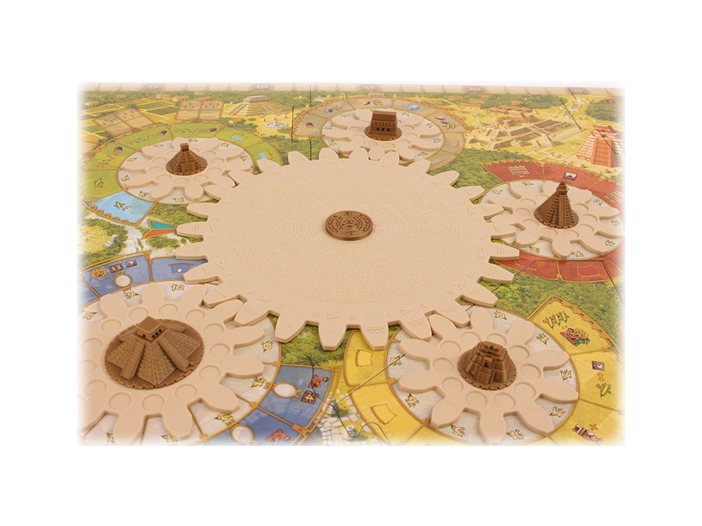 Models of the temples of Tikal, Chichén Itzá, Uxmal, Yaxchilán, Palenque, and the relief on the calendar wheel for the game Tzolkin: Mayan Calendar.