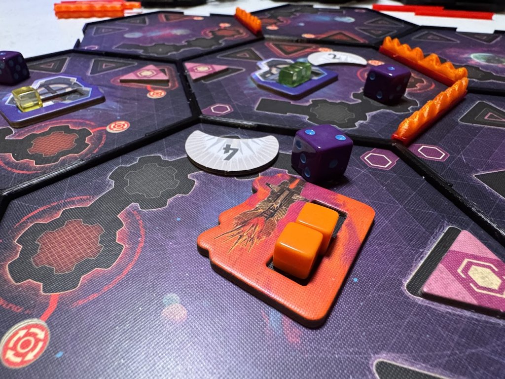 First player's star telescope token and plastic quadrant tokens in values 1 and 3.