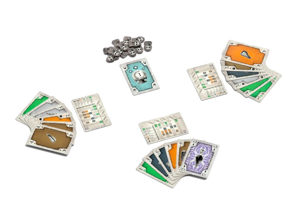 The Lead Witch plays two cards (one face down), while the two Lesser Witches combine one card each. Two ingredients of the same rank or suit get added together, leading to tricky situations!