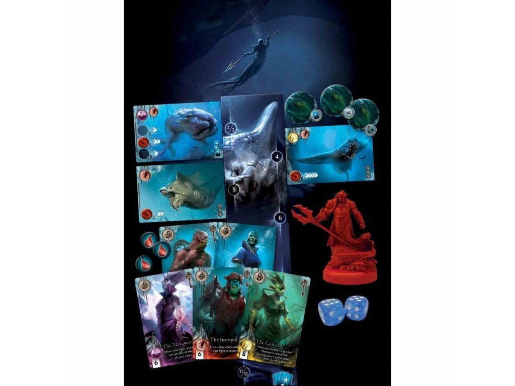 In Abyss: Leviathan, the threat track is replaced by the border board on which Leviathan cards will be placed. When you explore the depths, if the revealed card is a monster, you can fight a Leviathan on the border. Some new lords and some allies will help you fight, using their power. The player who has killed the greatest number of sea monsters takes the statue and wins 5 extra points at the end of the game — and if you do not fight, you may get injured...