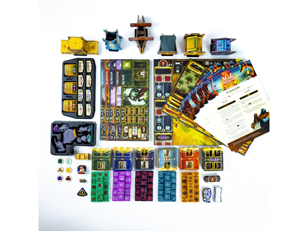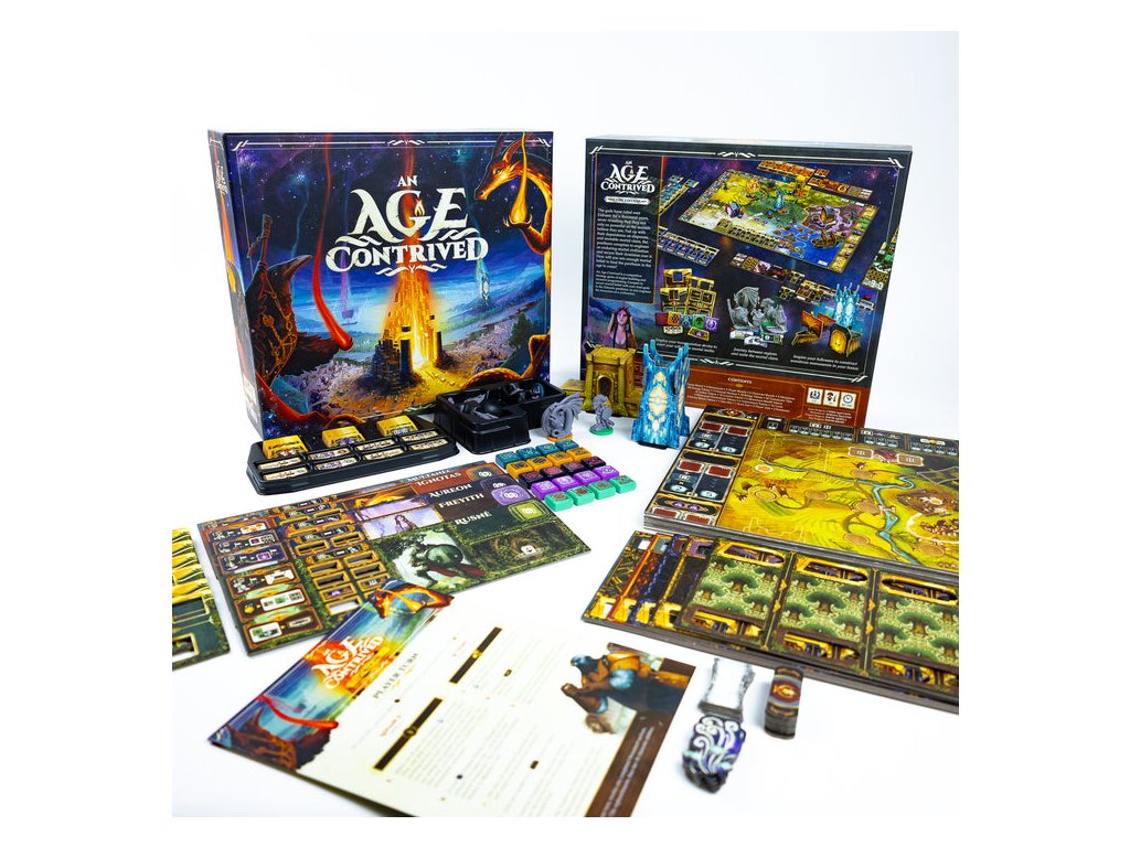 An Age Contrived is a fantasy euro game of engine building and resource programming. You play as a god in the Eldranic pantheon, where you are only as powerful as the mortals of this unstable world believe you are. Your goal is to establish yourself as the pantheon's prevailing god by securing mortal belief, as you advance the mortal realm from its age of darkness into civilization.