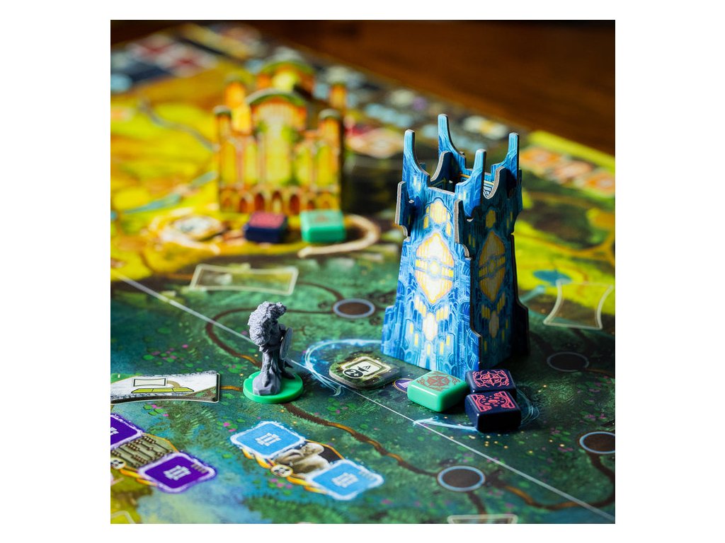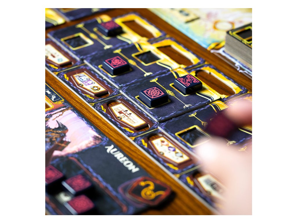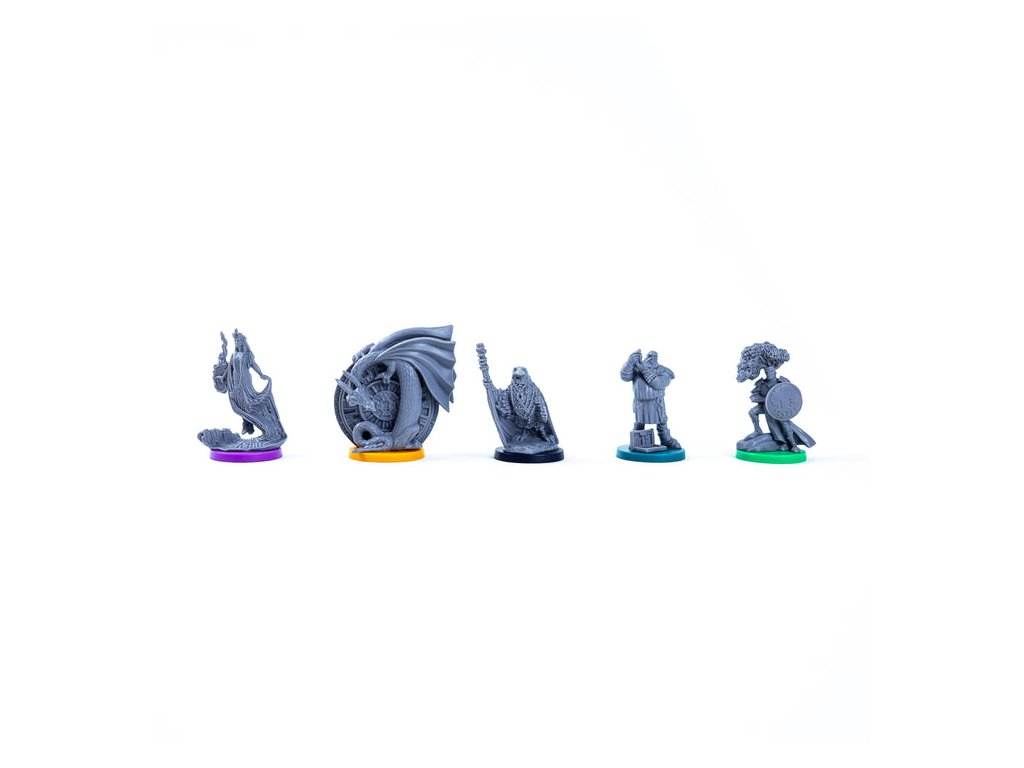 Each player receives a character board and a transmutation device, which they use to channel their energy into the mortal realm. Energy is how a god exerts its will, and is used to construct monuments, claim new tiles, and accomplish lasting achievements. Bind your energy for end-game scoring, and unlock new energy to replenish your reserves. The game ends when the last monument is complete, at which point the player with the most points wins.