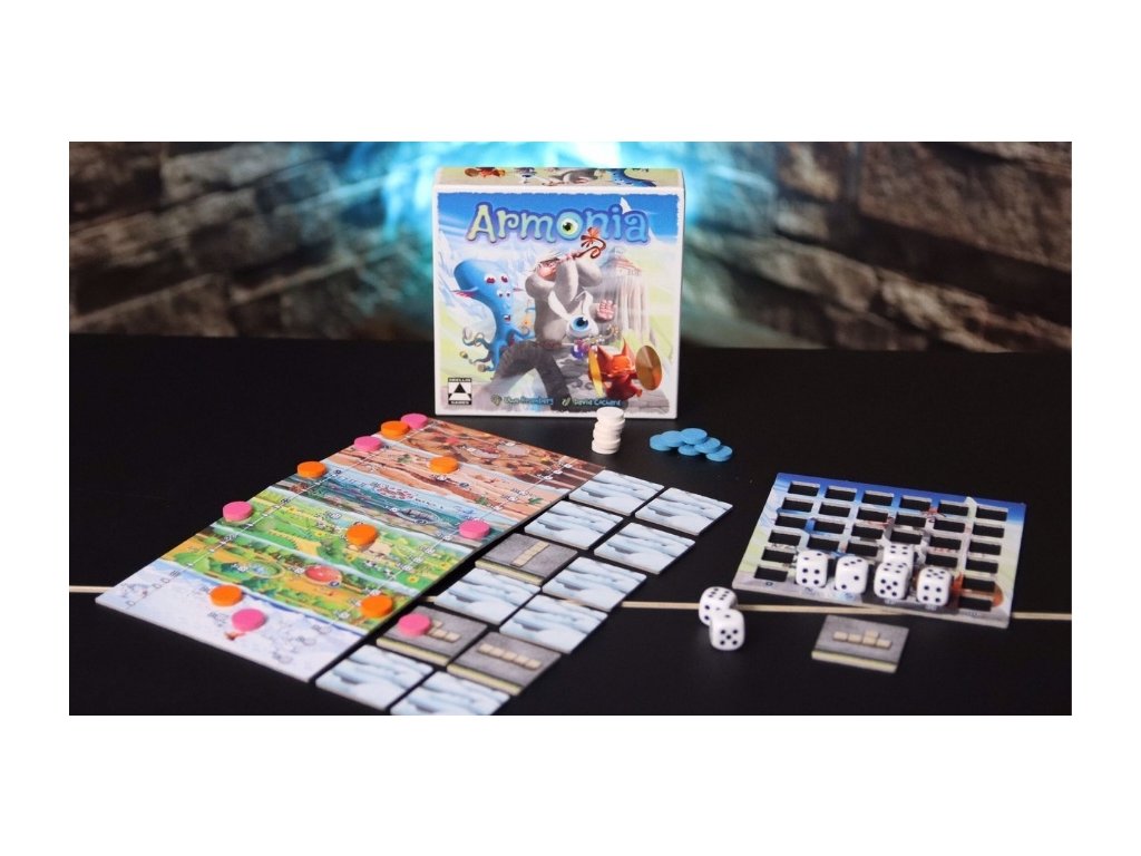 Armonia is a dice game for young and old, in which players roll the dice up to three times each turn to move their sound discs on their way to the Temple of Clouds. With the results of the dice, however, not only can the sound discs be moved, but also tasks can be triggered and fulfilled. Which of these brings the greatest advantage must be decided anew in each game situation. The player who makes the best decisions will be the first to forge four of his six sound discs onto the finished temple disc sets and thus win the game.