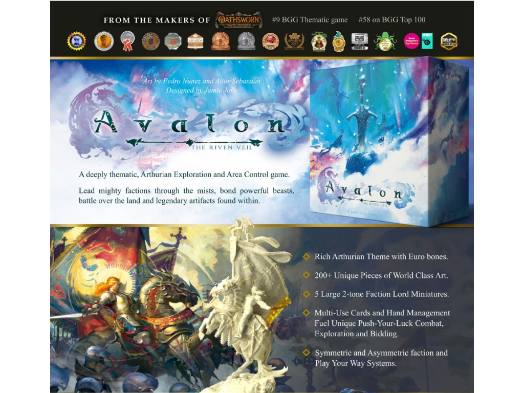 In Avalon: The Riven Veil, an Arthurian-based area-control and exploration game, you lead mighty factions through the misty veil to discover what awaits on the mystical isle of Avalon. Explore the mists, discover legendary items of power, bond mythic beasts, hunt for the grail, and prepare for war.