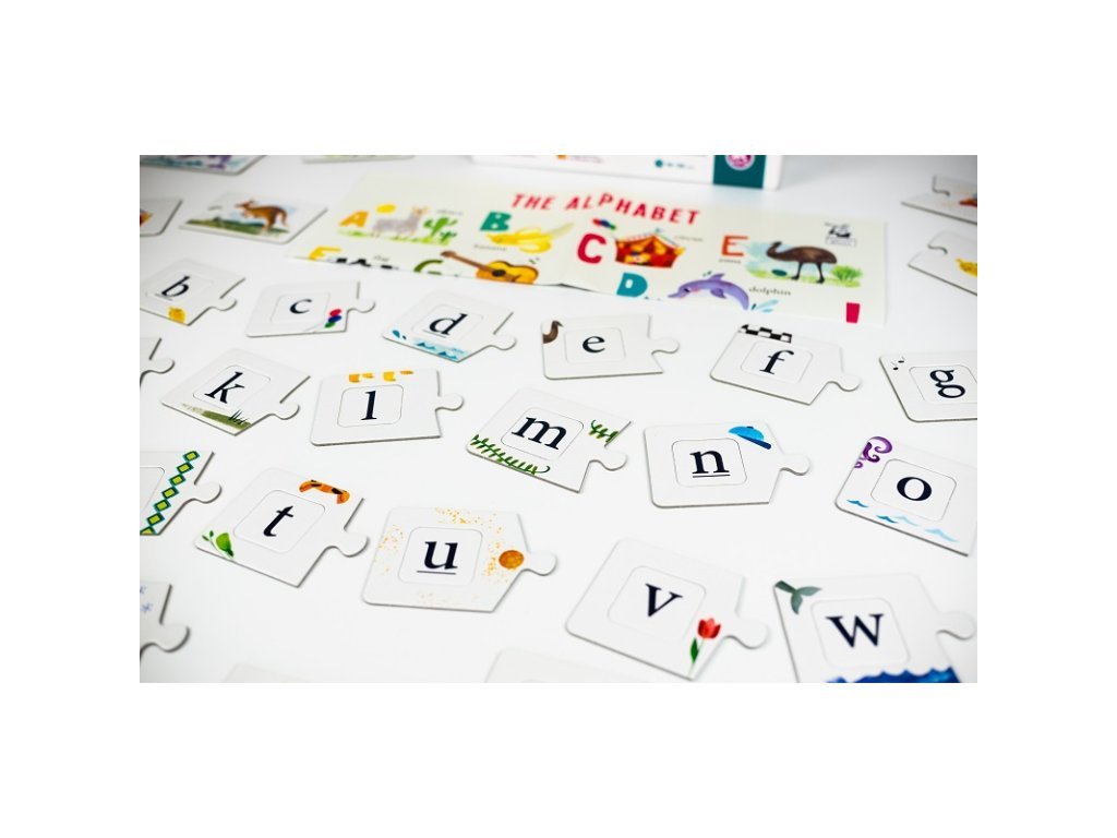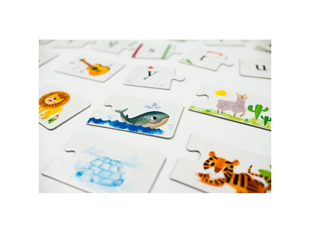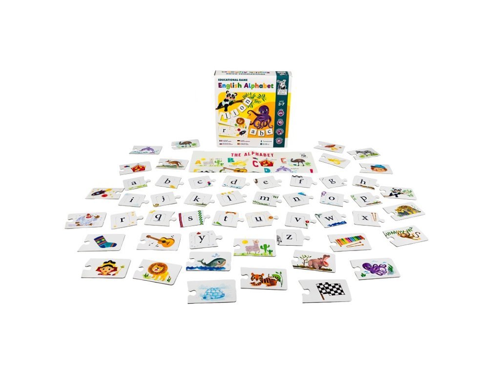 Game contents: 26 two-piece puzzle pieces with removable letter tokens, 12 tokens with additional letters, 1 color poster with the English alphabet.