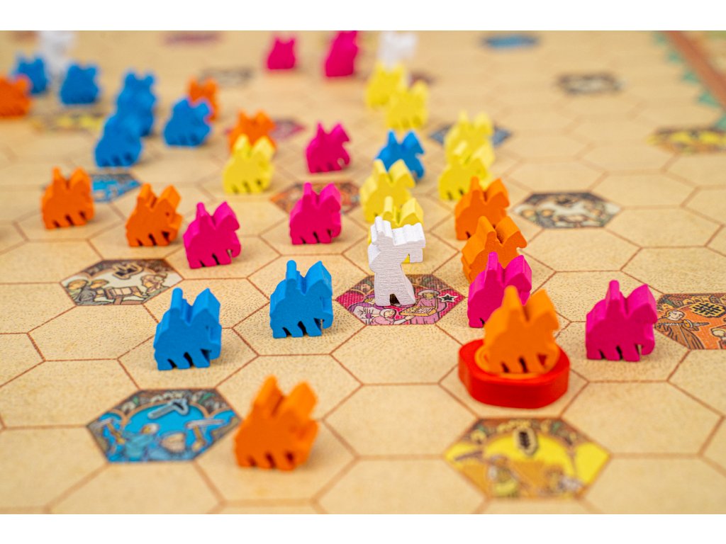 Players must decide between two competing strategies: build long chains of their envoys to achieve synergies and objectives, or establish smaller, separate groups of envoys to trigger timely town scoring. Both will award victory points, yet your victory points will mean nothing if you don’t also reach the end of your appointed success column.