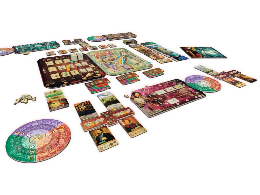 Unconscious Mind is a euro-style game featuring worker placement, engine building, multiple rondels, and cascading effects. On your turn, you may place one or two Ideas (workers) on a central Meeting Table to access a variety of actions, such as adding tiles to your player board, drafting and playing cards, and moving around the city of Vienna. Where you place your Ideas also determines how far to advance your rondel’s inkpot, activating a row or column of tile effects on your player board.