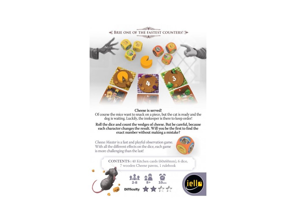 In Cheese Master players are rolling all dice and need to be as fast as possible to figure out how many cheese are left on the floor. Each die will show animal faces or cheese pieces and create a funny interaction that you will need to understand before your opponents.