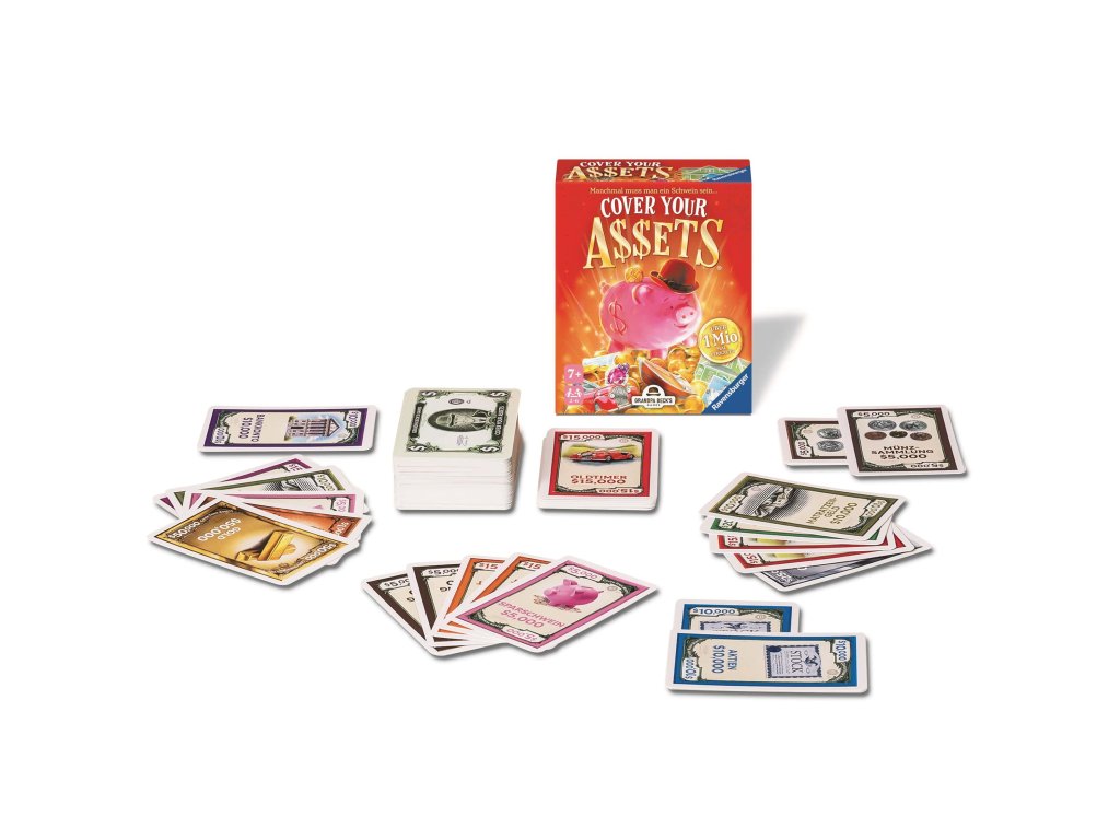 In Cover Your Assets, players compete to become the first millionaire by building towers of matching sets made from 10 different types of asset cards (things like jewels, piggy banks, classic autos, and more). Each new set that is created is stacked crosswise on top of the previous set, covering, and protecting, all the sets beneath it.