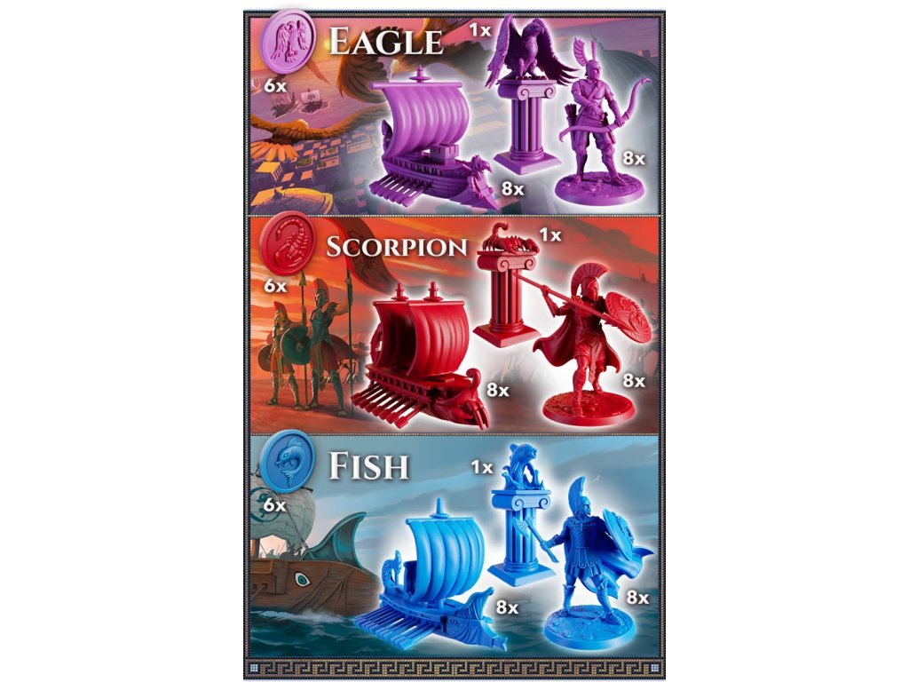 This box adds over 110 detailed miniatures and plastic pieces to upgrade the player components of Cyclades: Legendary Edition.