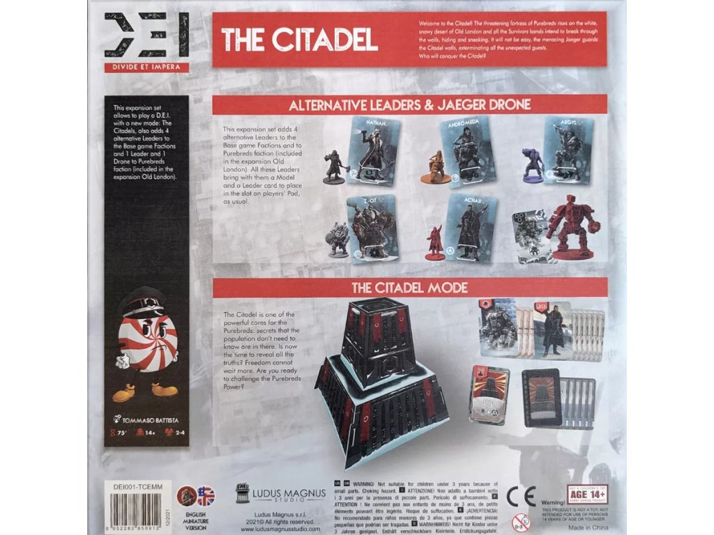 With The Citadel Expansion, you can play your D.E.I. games in a new mode: The Citadel! It also adds four alternative Leaders to the Base game Factions, plus one Leader and one Drone to the Purebreds faction (included in the Kickstarter Exclusive Old London Expansion).
