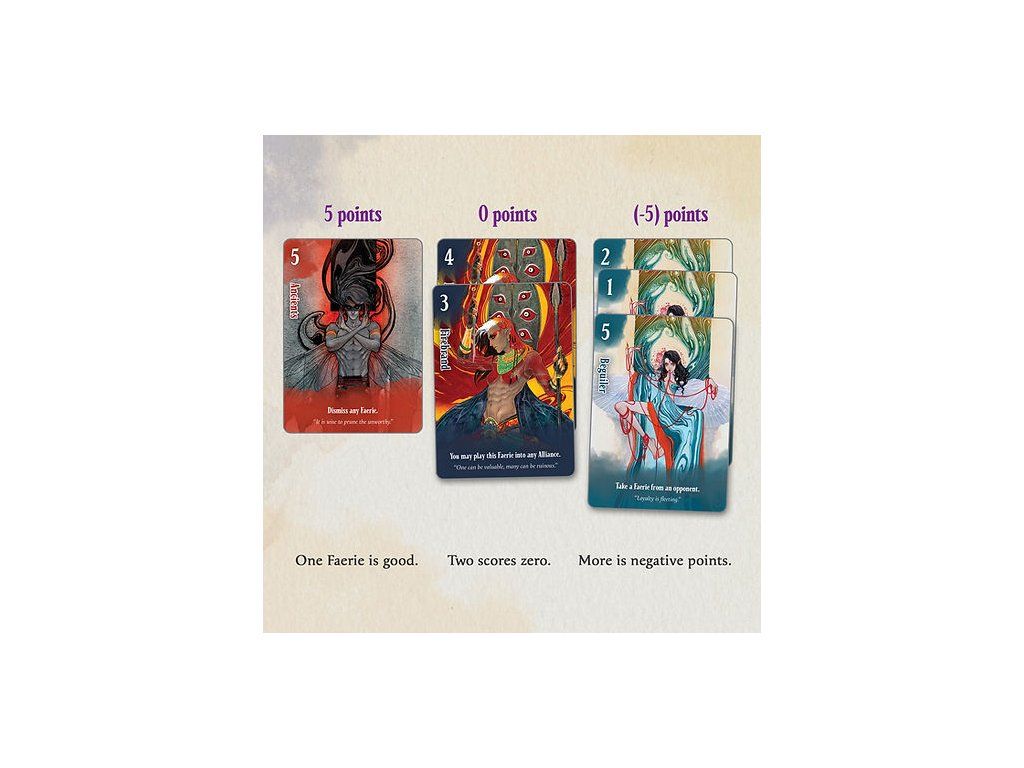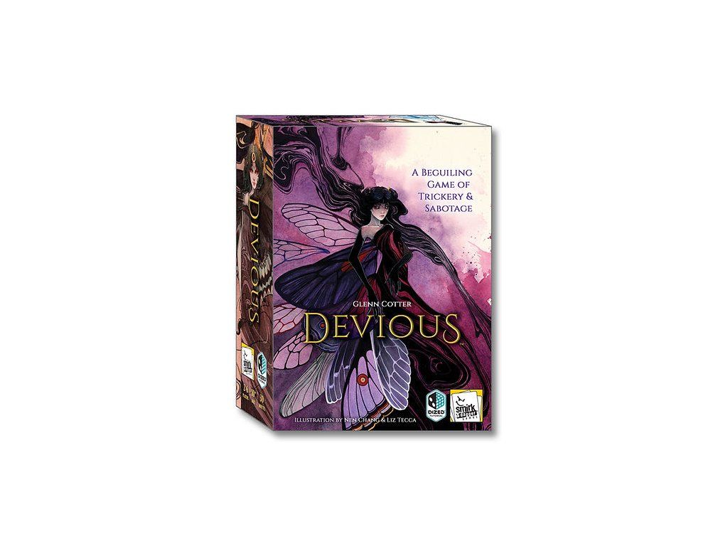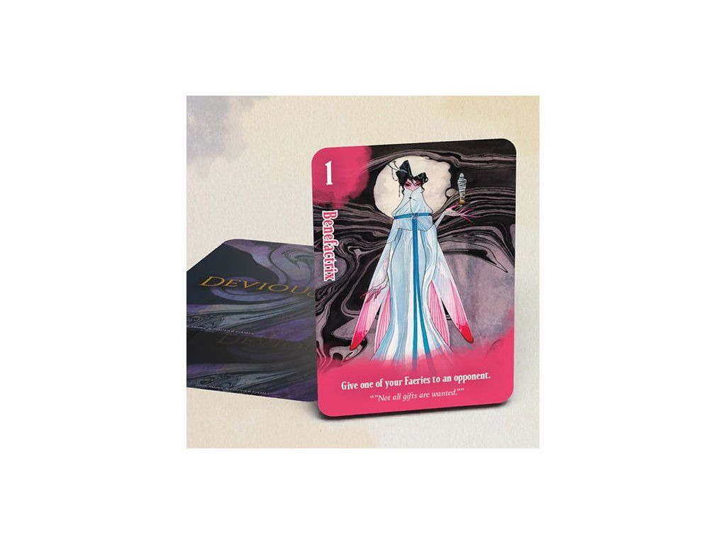 Devious is an anti-set collection card game. Build the strongest faerie alliance over five rounds and claim the crown. To do so you must play and hold in your tableau a single faerie from each of the faerie tribes, of the highest rank possible. But be wary, a second faerie of a given tribe negates your score - and more than two plunges your score into the negatives. Seek only the highest ranking faerie from each tribe for the strongest alliance possible. But each tribe has a unique power and the ability to manipulate faeries from around the table, including your own. Gaining the upper hand will be both chaotic and devious.
