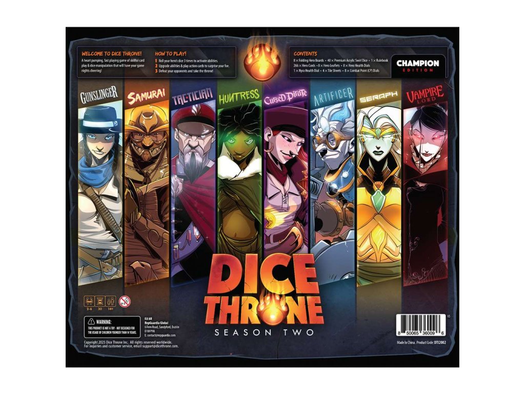 Dice Throne: Season Two Battle Chest expands the thrilling tournament of champions with 8 new heroes, each boasting custom dice and unique abilities. Featuring fast-paced, dice-rolling combat and tactical card play, this competitive game supports up to 6 players in various formats, including 1v1, team battles, or free-for-alls. With intuitive gameplay, diverse characters, and endless strategy, Dice Throne delivers excitement for both beginners and veteran gamers. Packed in a premium Battle Chest, it’s perfect for game night and easy to store!