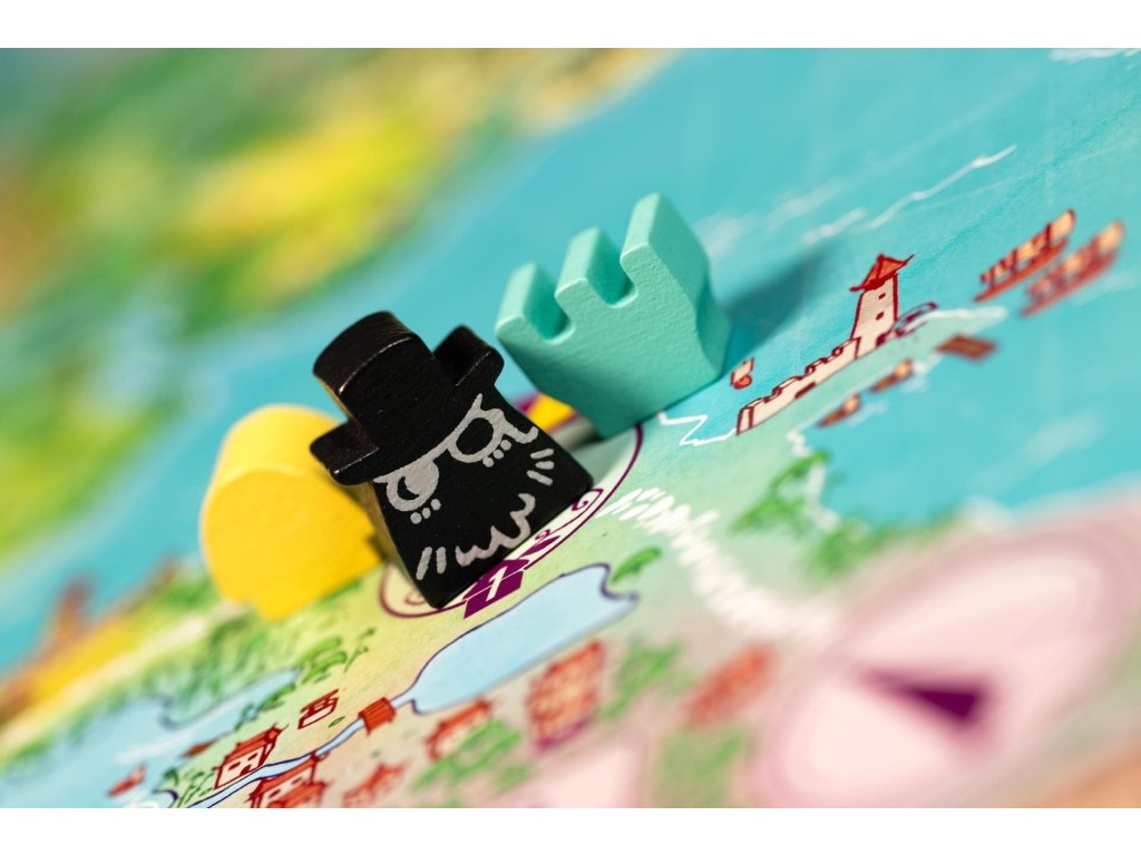 After drafting Adventure cards, you'll use the same tokens you drafted from the bag to visit locations on the mainland of Navoria in a worker placement phase. Worker placement locations reduce in power after each token is placed so you'll want to visit each location first to get the best benefits!