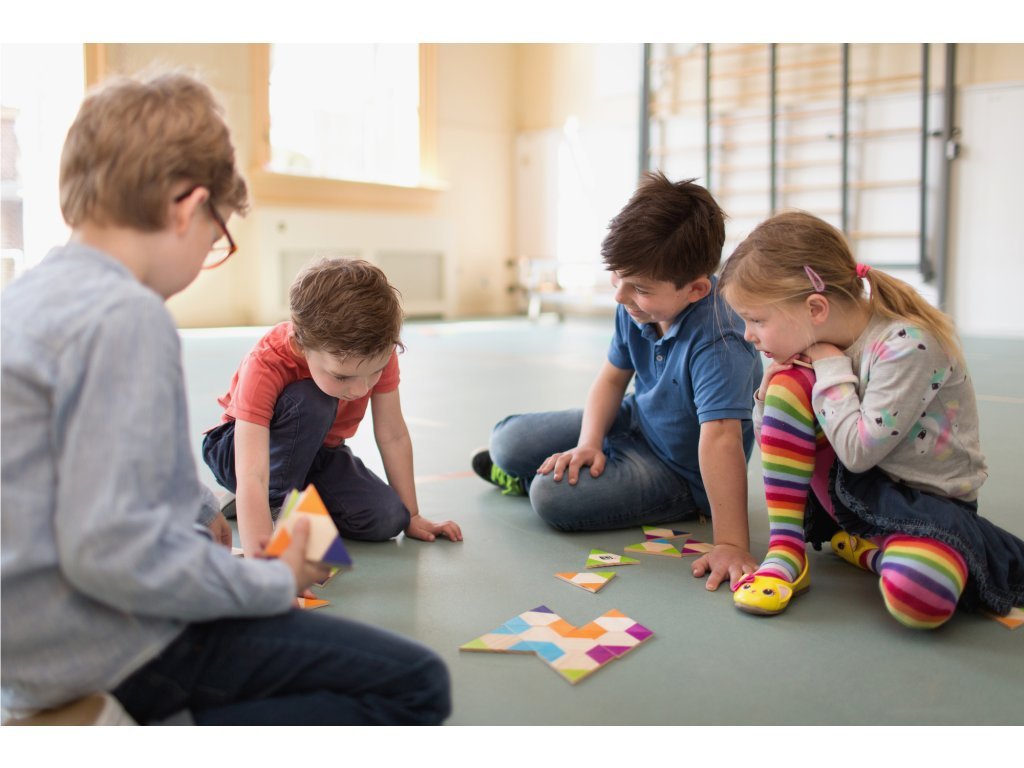 A popular domino game for 2 to 4 players aged 6 and up. In this game, players try to match triangles with corresponding colors to create beautiful patterns! The winner is the first player to get rid of all their tiles. The game develops spatial imagination.