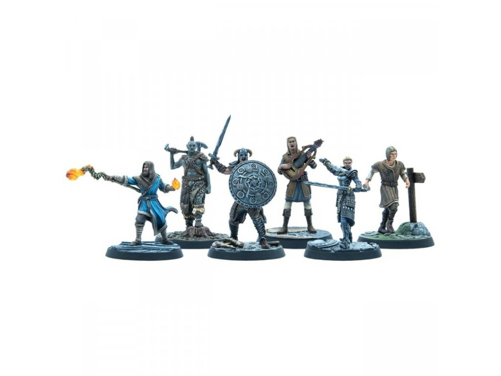 Skyrim is full of brave adventurers, seeking fame and fortune in this majestic land. Standing strong against all foes is the STEADFAST DRAGONBORN. His equal in valor is DELPHINE, agent of the Blades. As strong of arm and ready to fight, LOB willingly joins the fray, as the BRETON FIRE MAGE casts burning spells in support. SVEN THE MINSTREL bolsters the group with tales of strength and heroics, while the COURIER can be relied upon to inform them of more opportunities for adventure.