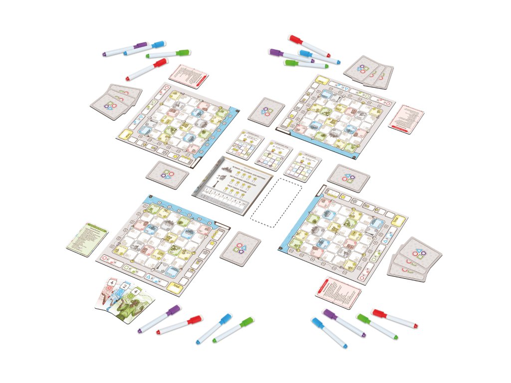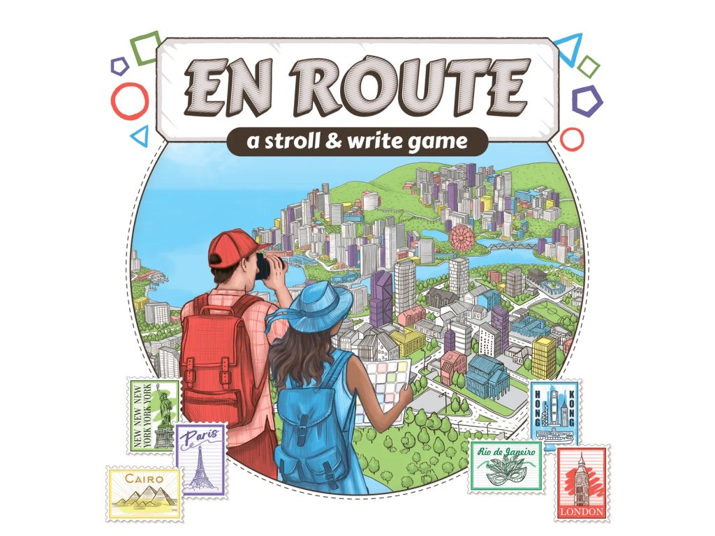 En Route is a flip-and-write game in which you create tour routes to the most interesting landmarks of the real-world cities (London, New York City, Hong Kong, Paris, Cairo, and Rio de Janeiro) and the made-up First City packed full of geek references. Every city features basic and specific mechanisms, so all of them play and feel differently.