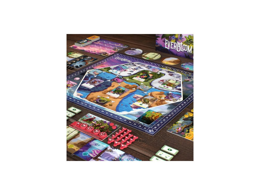 In Everbloom, lead one of six pollinating factions: Bats, Bees, Butterflies, Hummingbirds, Lemurs, and Lizards to create an abundant habitat full of hybrid beings. Each round you'll send pollinators from your faction into the wilderness to landmarks in the hopes of attract hybrid beings to your habitat, eventually pollinating their flora in exchange for nectar and points. Along the way, you’ll complete blooms and gather nectar cards to make sure your habitat flourishes. After the final round, you will gain points for the nectar you've collected in each biome as well as your progress on the bloom track, the faction with the most points wins!