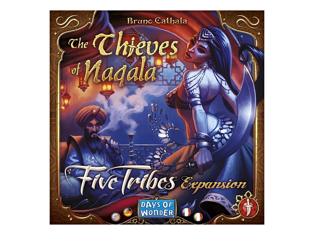Five Tribes: The Thieves of Naqala is a mini-expansion of six thief cards and one new djinn for Five Tribes that introduces a new element to the base game to create a real thorn in your opponents' sides. The djinn is shuffled into the deck with the other djinns and protects you from the effects of thieves. One thief card is revealed at random at the start of the game, and whenever someone would buy a djinn, they can purchase the thief card for the same price as the djinn. Each thief is associated with one of the tribes, and whenever you take an action with that tribe, you can choose to activate and discard the thief. If you do, everyone else must get rid of something — two resource cards, one tile they control, even a djinn or palace — after which you get to choose to keep something from all the discarded things.