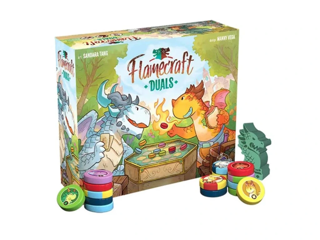 Flamecraft Duals is a two-player abstract pattern-building game that takes about 30 minutes to play. Each round, a player draws a dragon from the bag and places it on the shared central board. Every dragon type has a special ability that can be fired up to draw more dragons or rearrange those already on the board. You want to match three dragons on the board to the pattern on the shop cards in your hand to score them. Once all the dragons are drawn from the bag, the game ends and the player with the highest score wins.