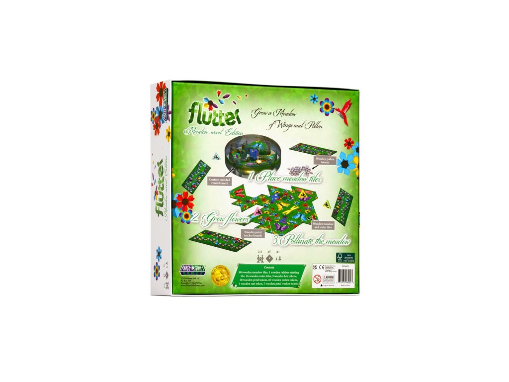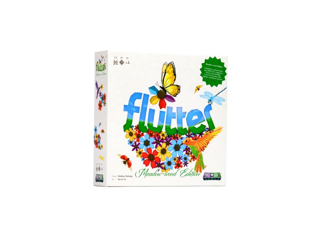 Flutter is a strategic tile-laying strategy game. Players take turns laying tiles of varying shapes, earning petal tokens for matching flower petals in each corner. As the game progresses, players will spend those petal tokens when they enclose a previously laid tile, supplying the tile's pollinator with all the flowers it needs, earning pollen. Once a single stack of tiles in the supply rondel has been emptied, the player with most pollen is the winner!