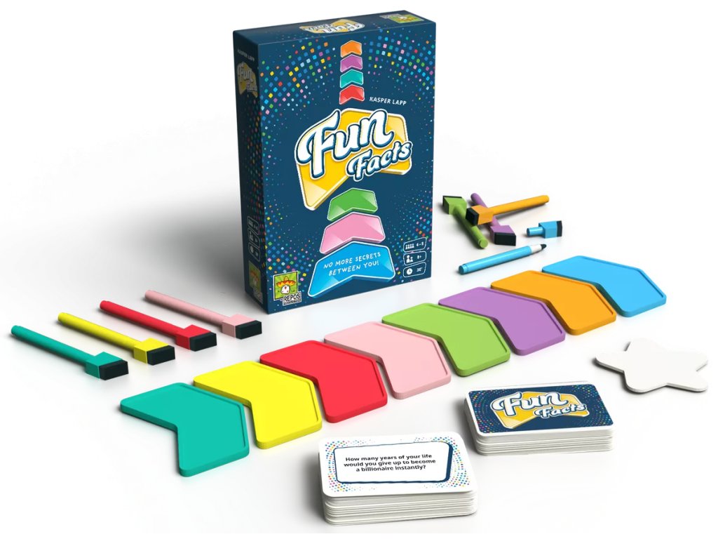Each round in Fun Facts, a question is placed in the center of the table, e.g., "How long is the perfect nap?", then everyone secretly writes their answer on their colored arrow and places that arrow face down on the table. (You write your name on the other side of the arrow so that everyone knows which arrow is whose.)