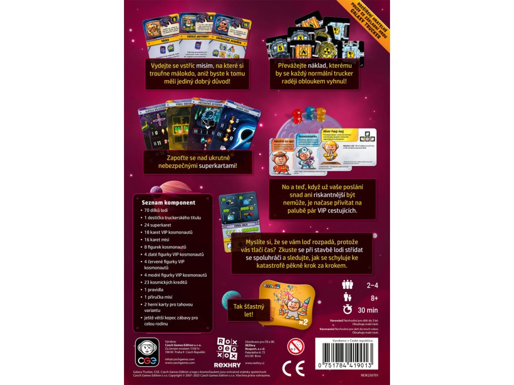 In the fast and goofy family game Galaxy Trucker, players begin by simultaneously rummaging through the common warehouse, frantically trying to grab the most useful component tiles to build their spaceship — all in real-time. Once the ships are launched, players encounter dangerous situations while vying for financial opportunities, each hoping to gain the most valuable cargo and finish...