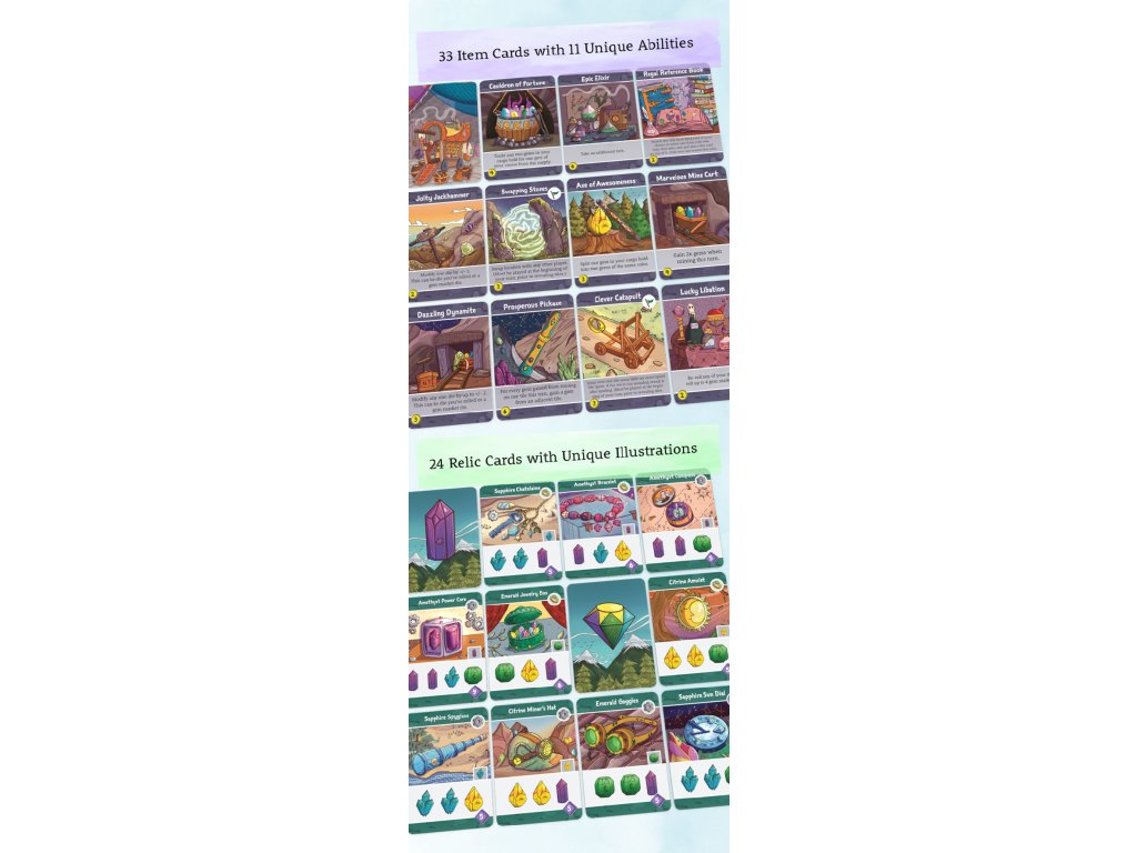 Explore Iridescia by flipping over land tiles, revealing the gems hidden beneath them and then roll dice to mine them. Each gem color is tied to a dice value that can be manipulated to help your cause. Roll high enough, and you can claim more gems, adding them to your cargo hold providing you with a valuable resource for restoring relics and scoring royalty points!