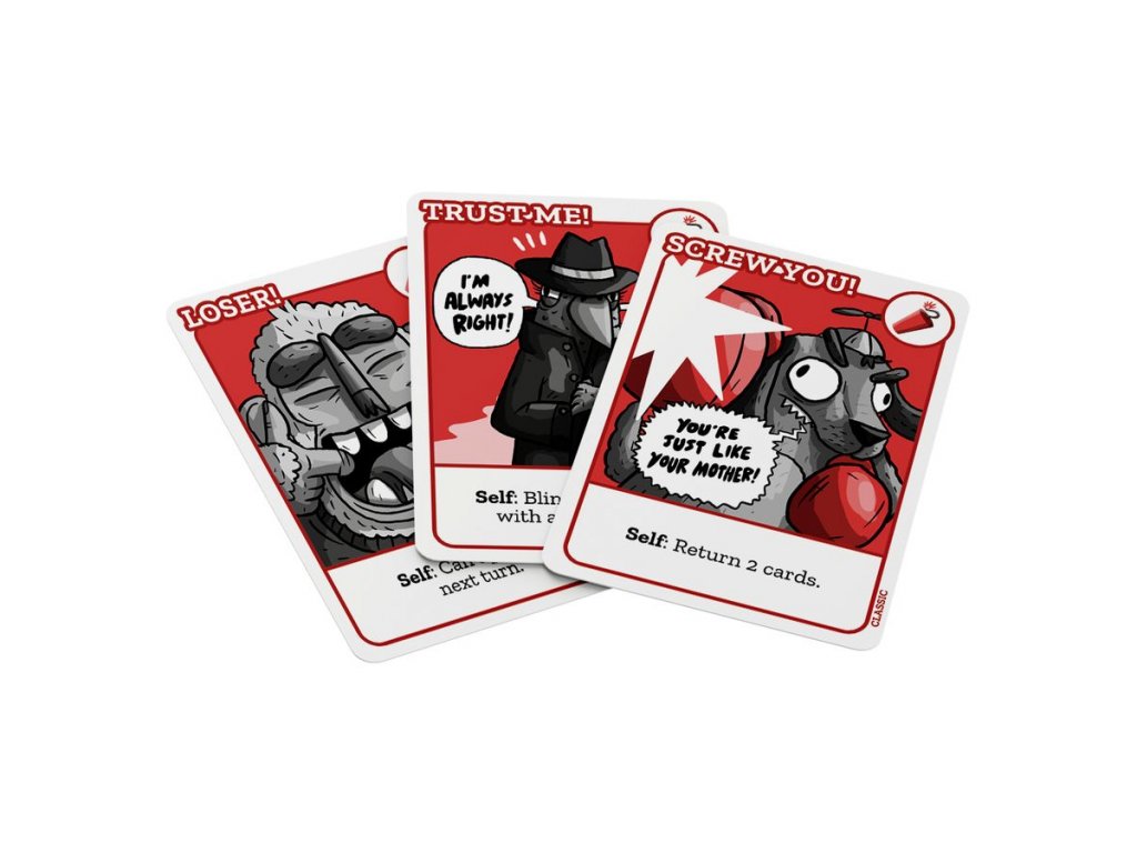 Alternate between drawing cards and playing cards from your hand. Each card has consequences. Some cards shrink your hand, others limit your options. The twist is that by attacking your opponent, you deal with it, not them. It's the only card game where playing the least bad option is the best. The game is similar to other casual games (card management, elimination, take-that). It's not about actual role-playing or arguments.