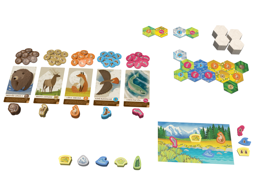 - Beautiful design: The game includes illustrated cards and tokens featuring five types of animals—from the majestic grizzly bear to the agile salmon.