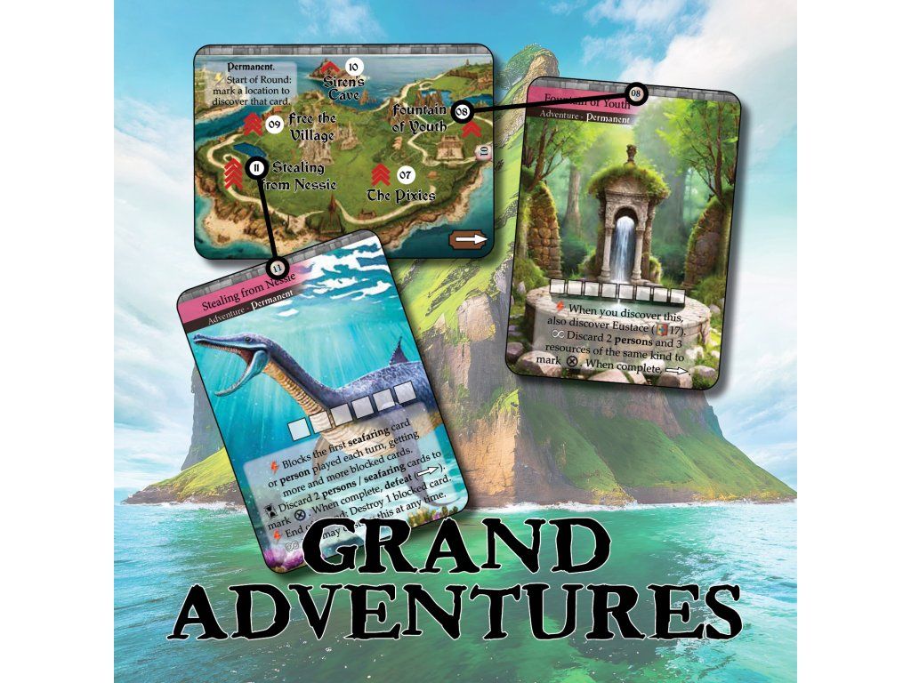This is an expansion for Kingdom Legacy: Feudal Kingdom.It offers 3 rounds of play, and 29 new cards to explore by embarking on adventures. It will take at least 10 rounds to explore all of them, so the contents of this expansion will overlap with future expansions played, so it is recommended to play this as one of your first 5 expansions.To play, you need to perform a purge 10 and purge 1 permanent card.The stories seem too fantastic to be true; giant sea monsters, sirens leading sailors astray, dragons and princesses, holy relics needing to be found, and all are pressing matters. The quests and adventures pile up as a large smorgasbord in front of you, how could you decide which one is best for your kingdom? Maybe you need to summon your wizard advisor and his lovely assistant?