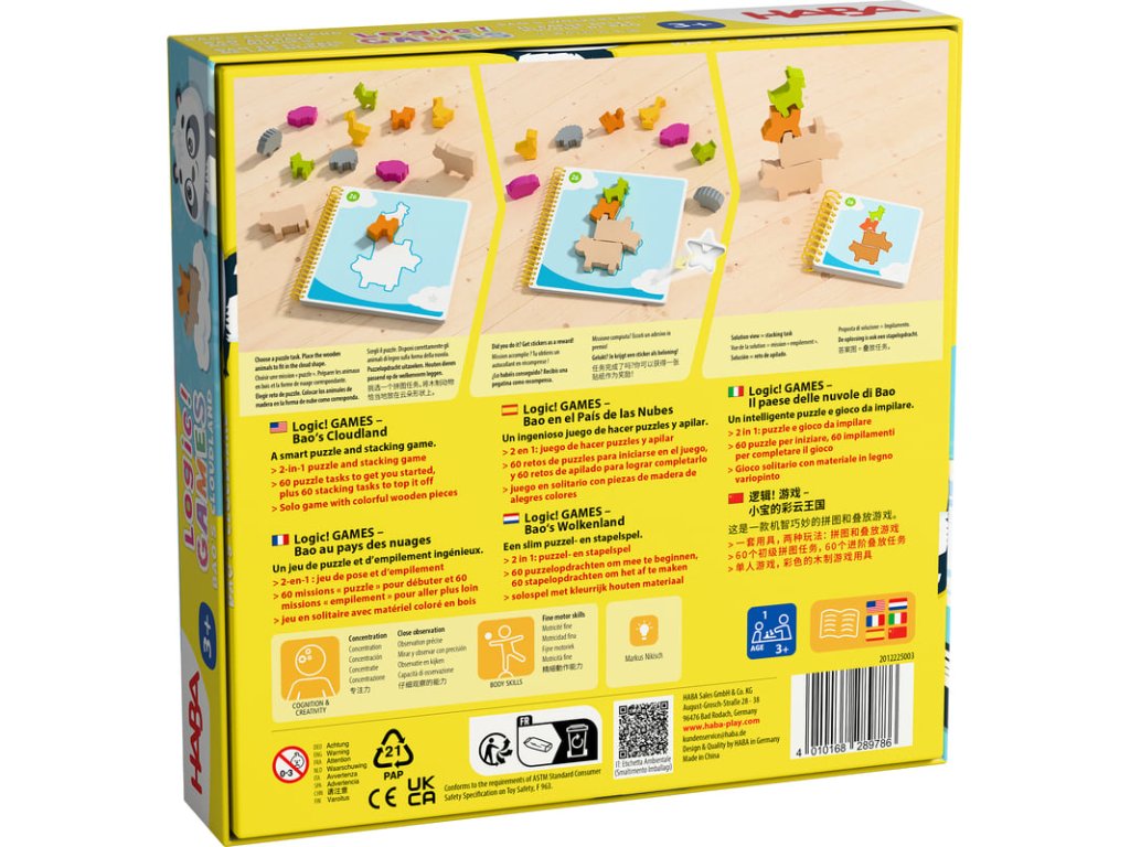 Children join Bao on a journey of discovery through the clouds. They recognize different shapes, fit the right animals into them like puzzle pieces, and stack them on top of each other. They need a keen eye and a steady hand! The difficulty of the 60 brain teasers and 60 assembly tasks gradually increases with each round. Who can solve them all?