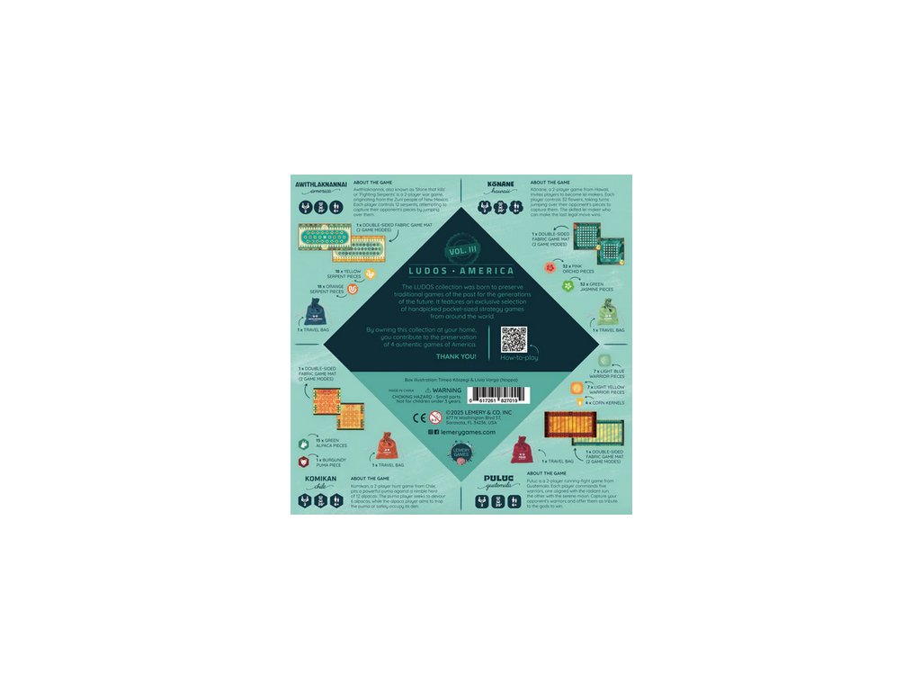 The third volume, LUDOS America features four, 2-player ancient strategy games from Chile (Komikan), Guatemala (Puluc), Hawaii (Kōnane) and the American Southwest (Awithlaknannai).
