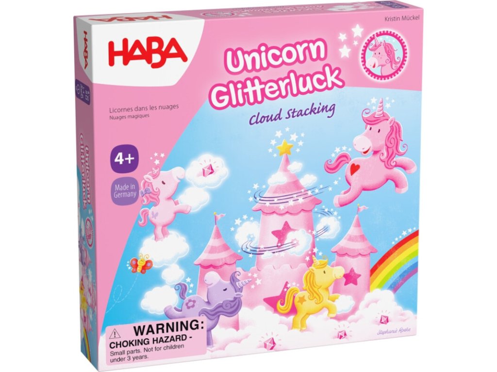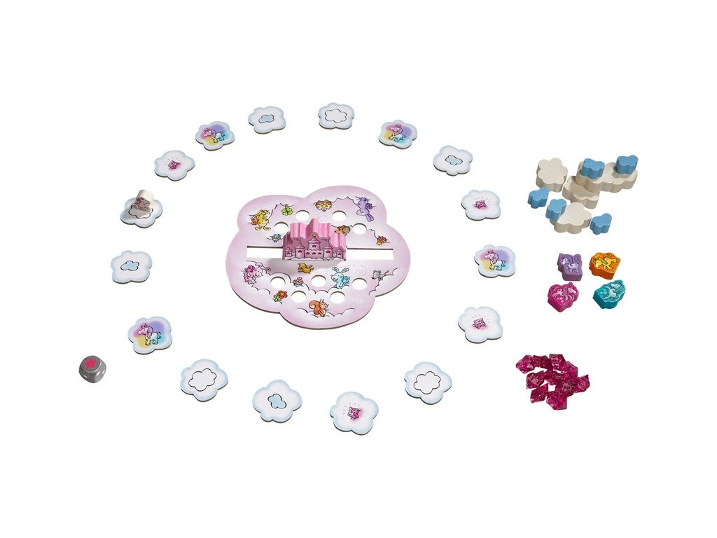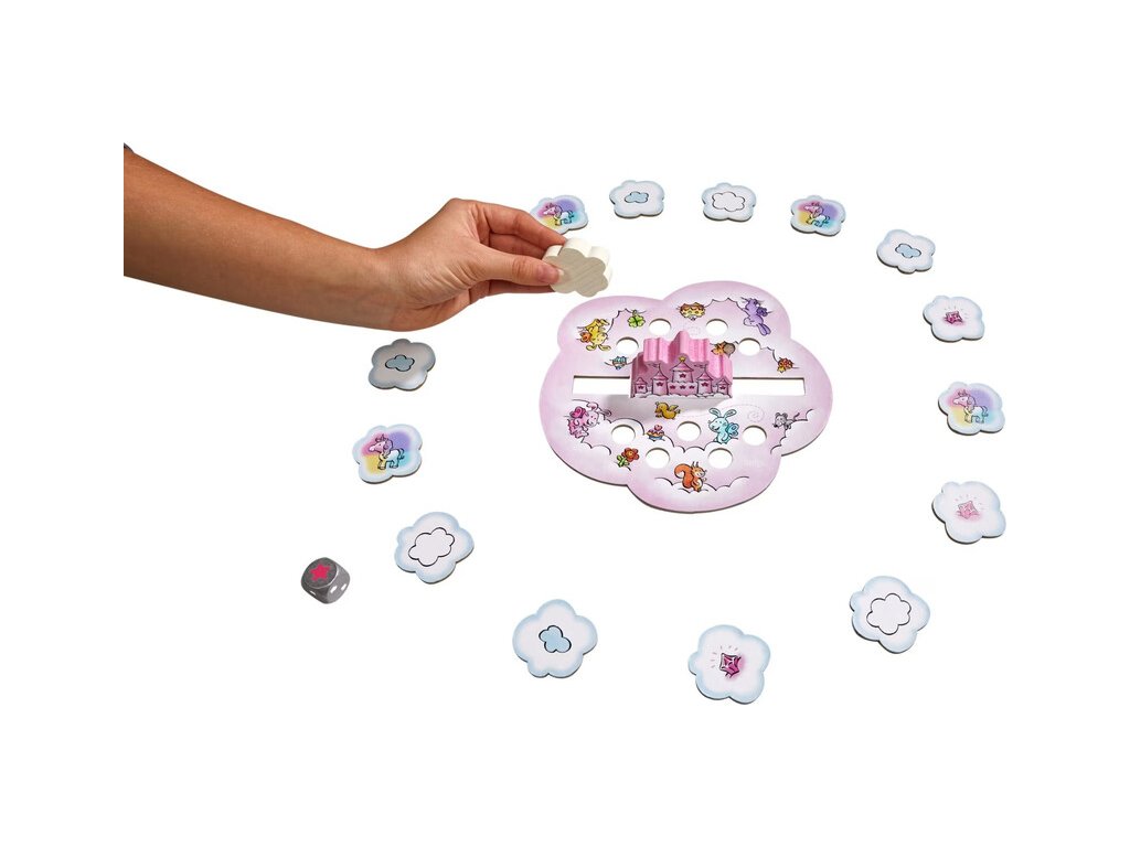 Cooperative game – Unicorns: Cloud Castle is a magical party game for 1 to 4 players aged 4 and up, which transports children to a world full of sparkle, clouds, and friendship. The unicorns Sparkling Happiness, Rosalie, Enchanted Flower, Magical Whirlwind, and Stardust live in a beautiful cloud castle, where their friends come to visit every day. But oh no – the castle is running out of space! The unicorns must therefore join forces, collect pink crystals, and build new towers together.