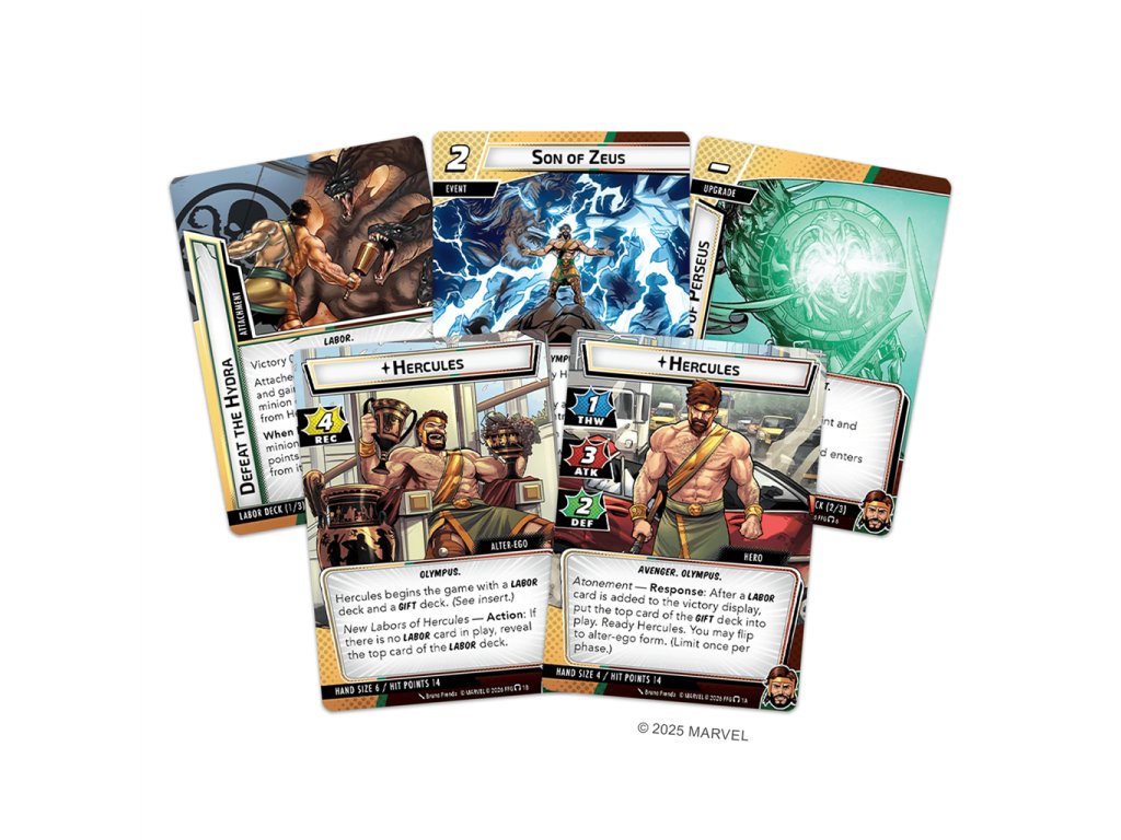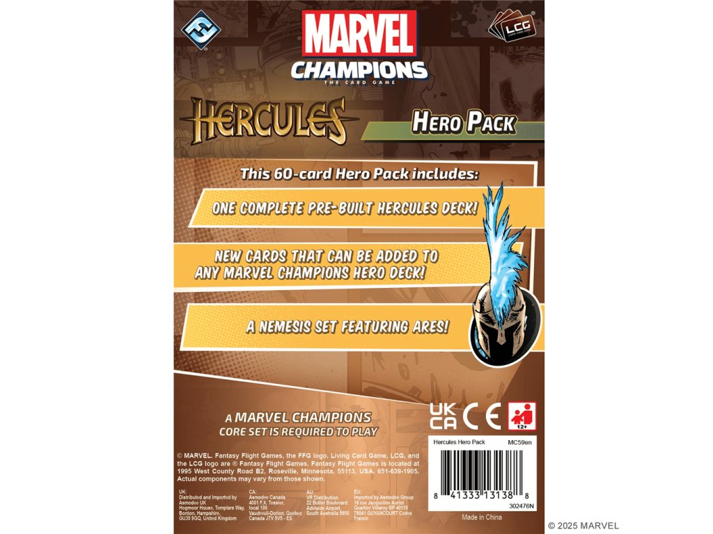 He is a man known by many names. Born Alcaeus, renamed Herakles, then—to distance himself from Hera—he was renamed again to Hercules. Now, his friends just call him Herc. This son of Zeus has had a tumultuous relationship with Olympus throughout his long life; sometimes he is their glory, other times their disgrace. But no matter what, there are few problems that he doesn’t first try to solve with his immense, godlike strength. Now, the mighty hero Hercules muscles into your games of Marvel Champions: The Card Game! With his immense strength and his ability to take on herculean tasks in exchange for mighty rewards, Hercules is a unique and powerful hero worthy of the fame his name brings. In this hero pack, you’ll find Hercules, his fifteen signature cards, his special side decks of gifts and labors, and a full assortment of Leadership cards inviting you to lead his fellow Avengers into battle.