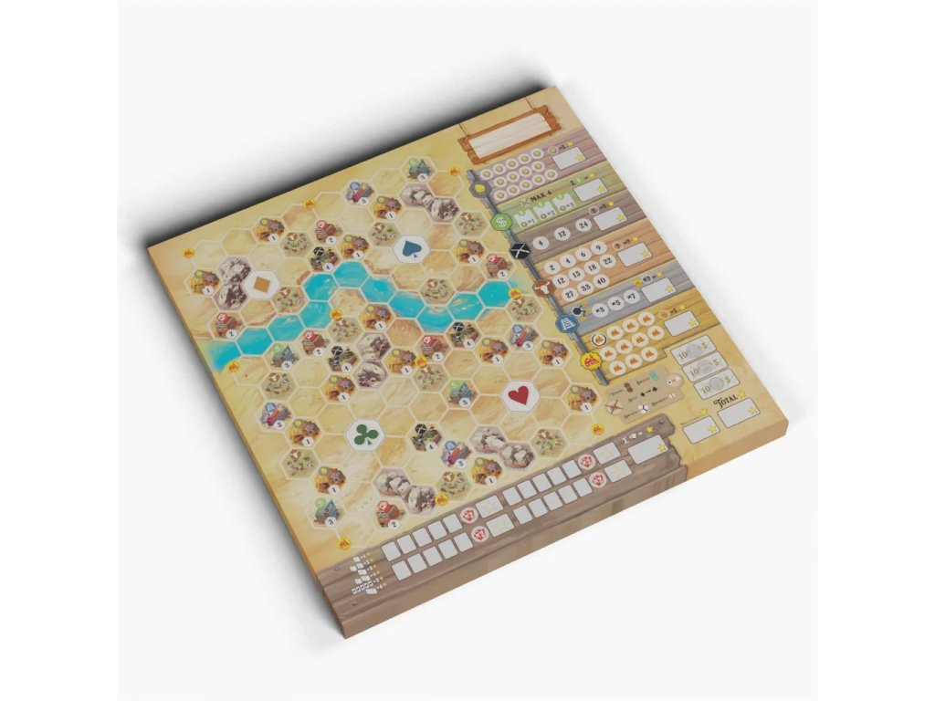 In this flip-and-write game, you use poker cards to extend your railway tracks and build a poker hand at the same time. Each turn, you choose one of the revealed poker cards. The suit of the card helps you extend your railway, connecting you to new towns and surrounding features. When you connect to a town, you gain the ability to do a one-time bonus. When you surround a feature with your tracks, you activate it for endgame scoring. The value of the card is added to your poker hand, for which you'll score additional points at the end of the round.
