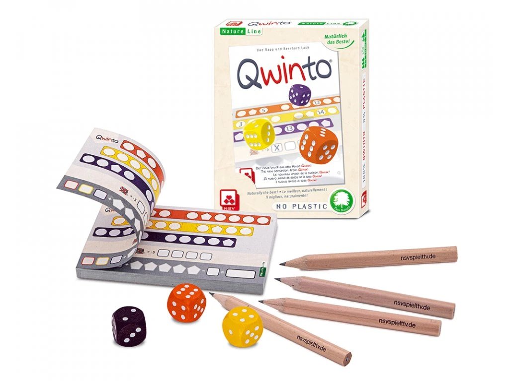Qwinto - dice is a new version of the card game Qwinto. Players try to write down the numbers 1-18 on their individual score sheets and fill in the empty spaces in three colored rows (orange, yellow, and purple). The colored rows must contain numbers in ascending order from left to right, and no number may be repeated. Numbers may not be repeated in the columns of fields below each other either.