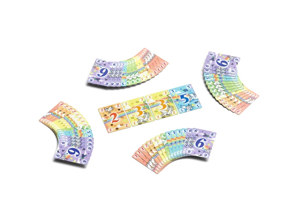 Rainbow is a quick-playing hand management game where players play solo cards, sets, or runs to win points on cards in the center of the table.The cards that were played in the previous round are the NEW points available to win in the next round. Most points at the end of the game wins!