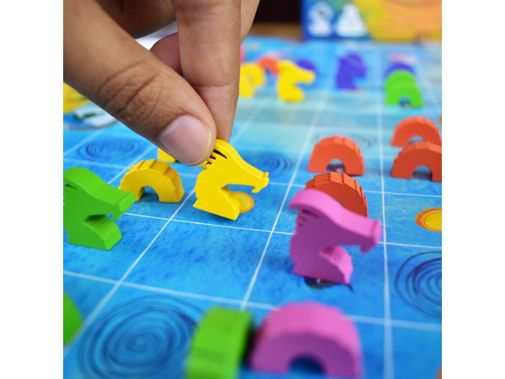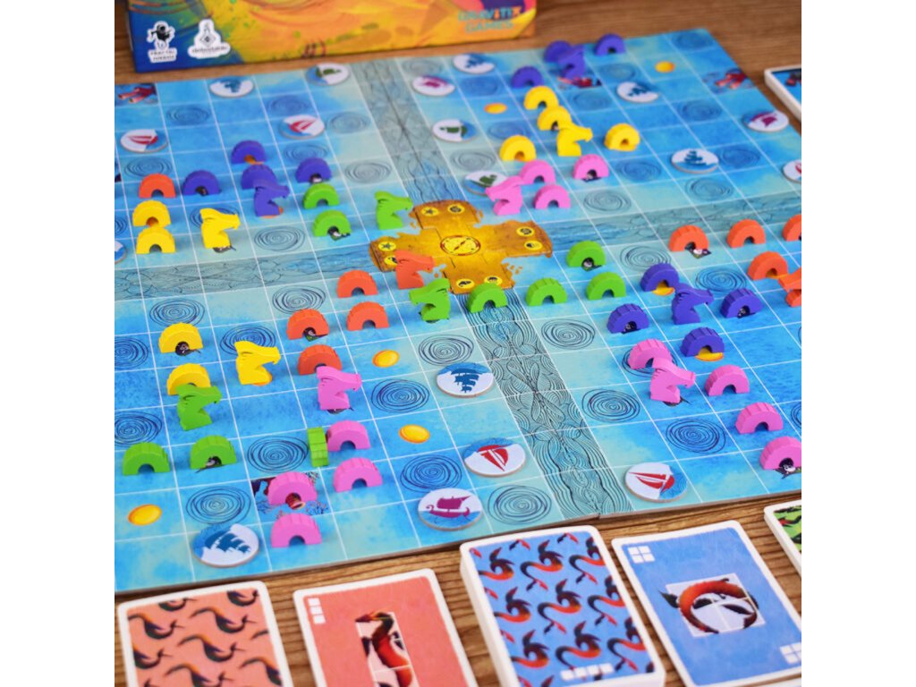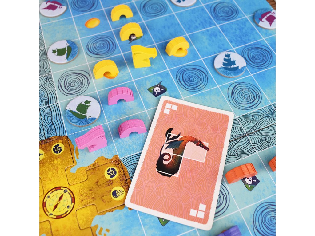In the game, each participant plays as a family of sea dragons who are seeking to become the protectors of the forbidden seas. Each turn, one of the two pattern cards from the hand will be played to position a sea dragon on the board, increasing your presence in all four sea kingdoms. You will be able to sink ships or collect treasures hidden in the ocean. Optionally you can complete missions with the ships that you are sinking. Note that you cannot place your own sea dragons next to each other, and if you place one next to another player's dragon, they receive treasures.