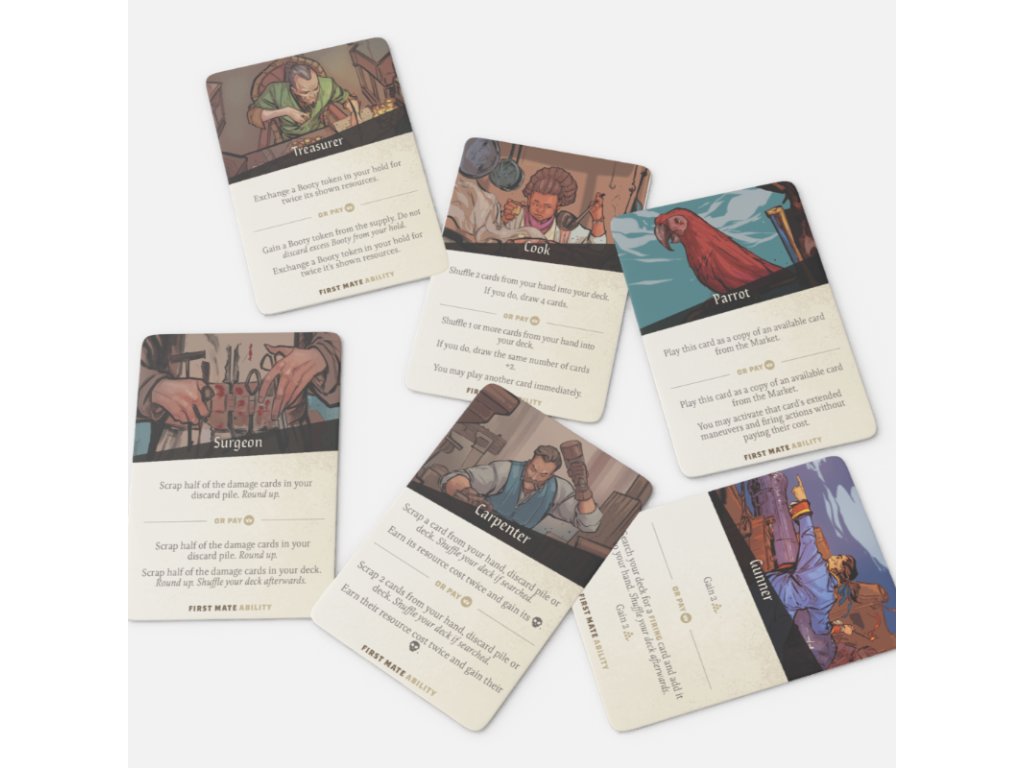 With our 8 unique First Mates, you’ll have even more ways to customize your starting deck. First Mate cards are an additional ability card in your deck. They each have a free action and a paid enhanced version of the action. At the start of the game, you’ll draw and draft them based on player count and place them immediately in your discard pile.